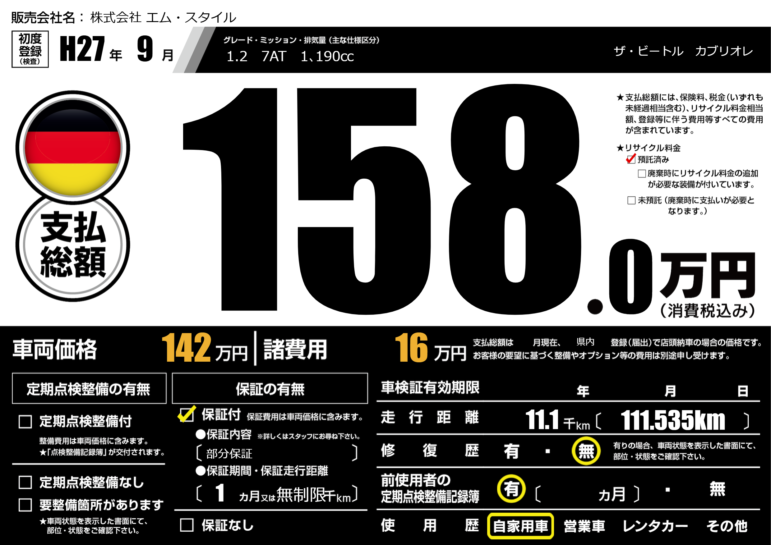 | 車名 | ザ・ビートル カブリオレ | グレード ミッション 排気量 |