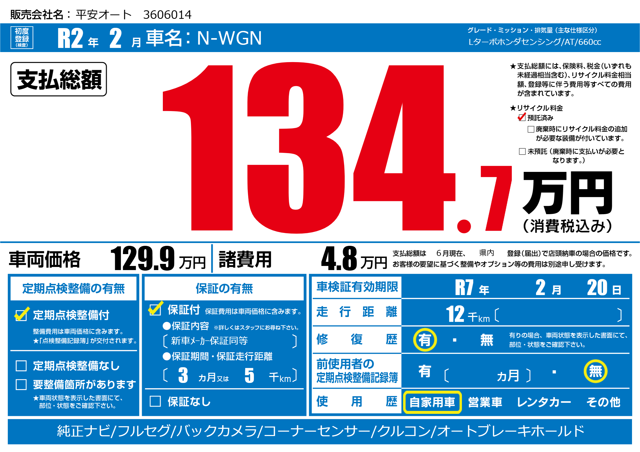 なし | 車検制限 | R7年2月20月 |