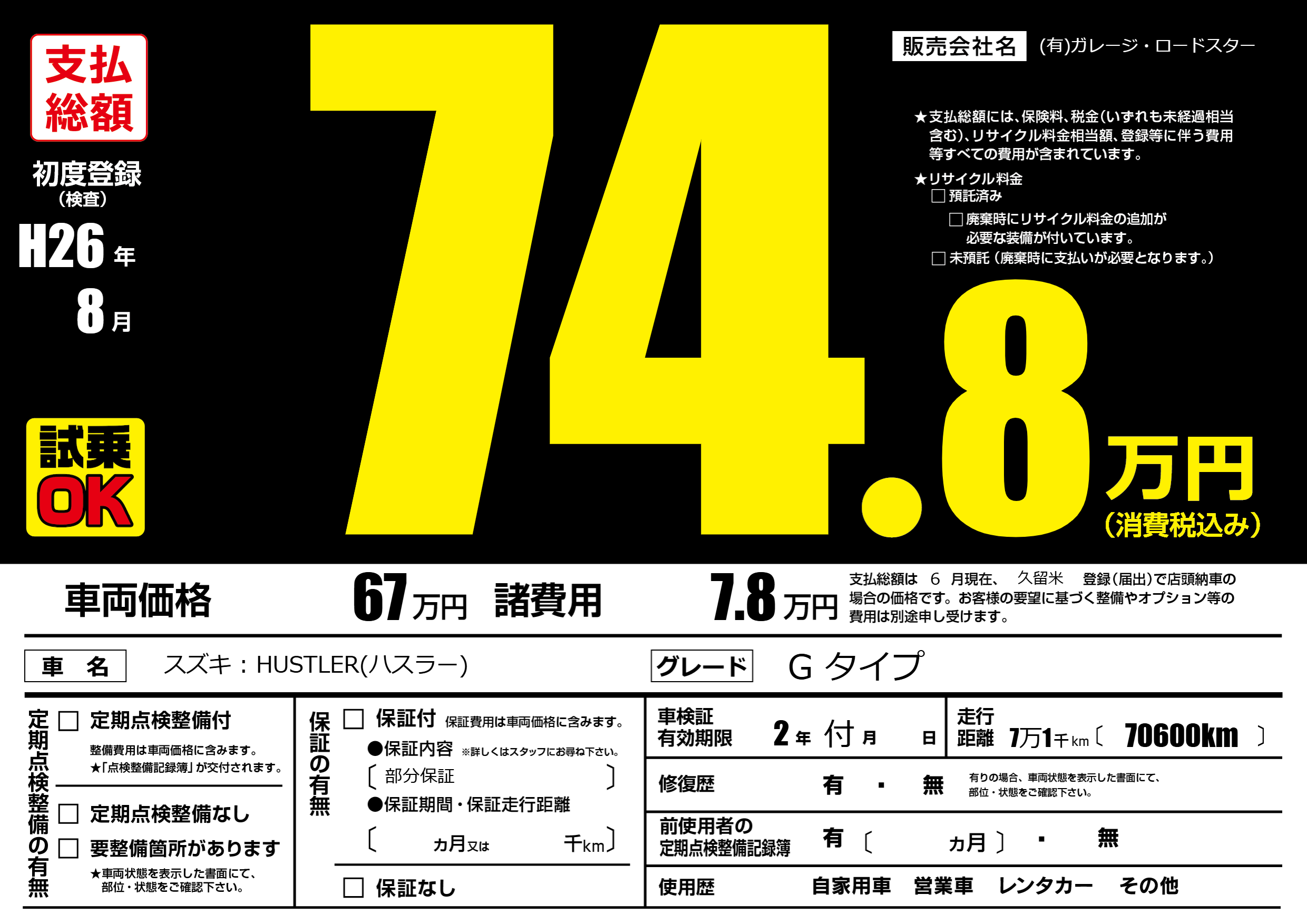 | 車名 | スズキ : HUSTLER(ハスラー) | グレード ミッション 排気量 |