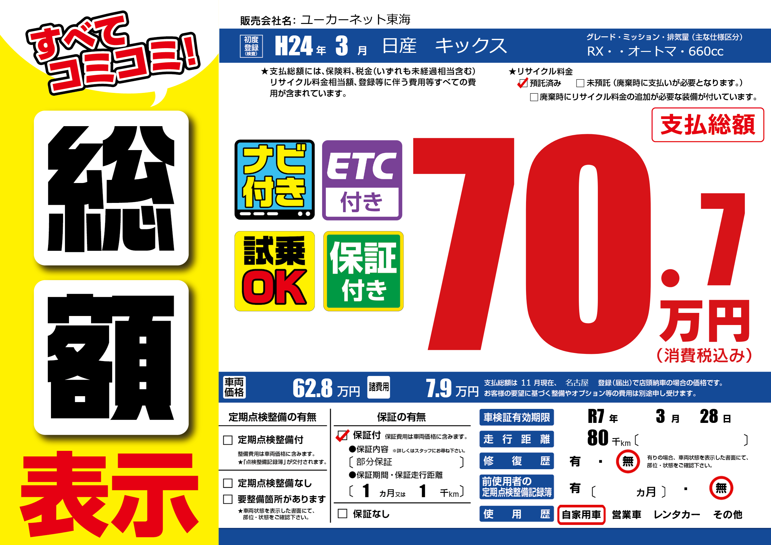 | 走行キロ | 8万km | 初年度登録 | H24年3月 |
