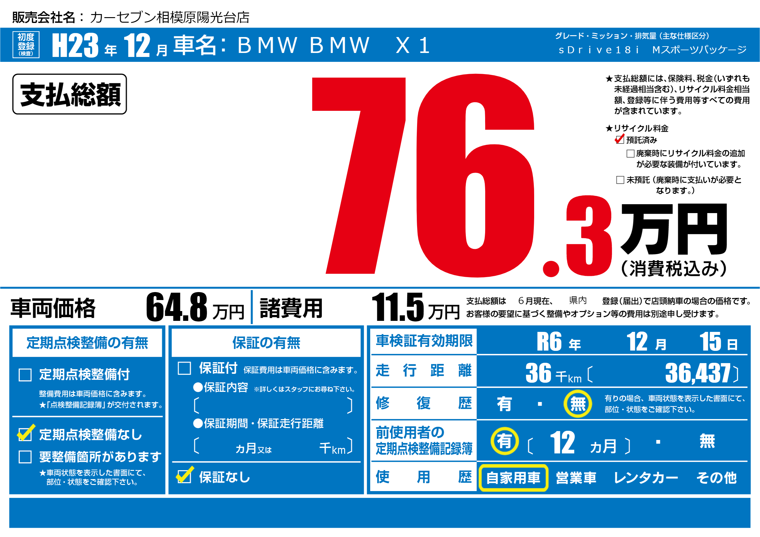 | 車名 | BMW BMW X1 | グレード ミッション 排気量 |