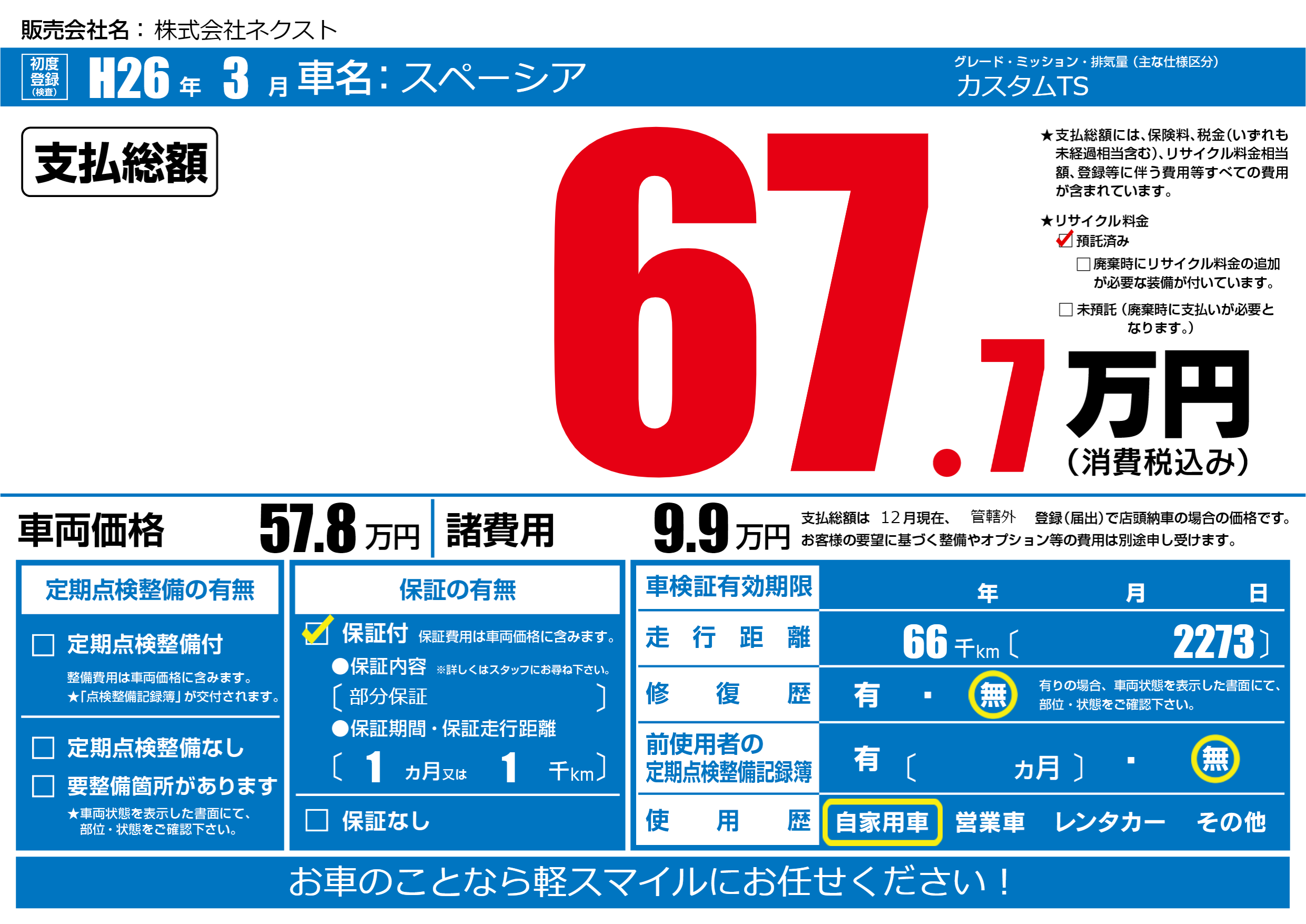 | 車名 | スペーシア | グレード ミッション 排気量 |