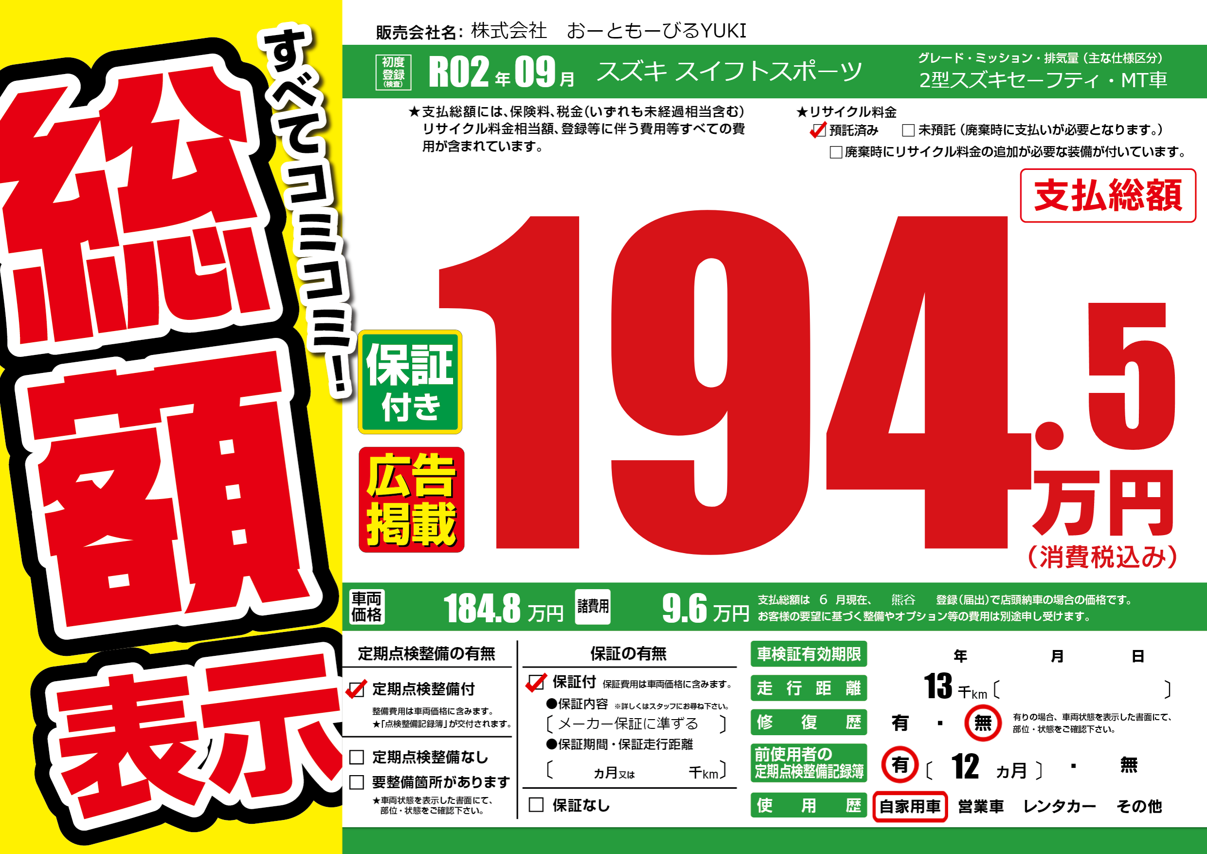 | 車名 | スズキ スイフトスポーツ | グレード ミッション 排気量 |