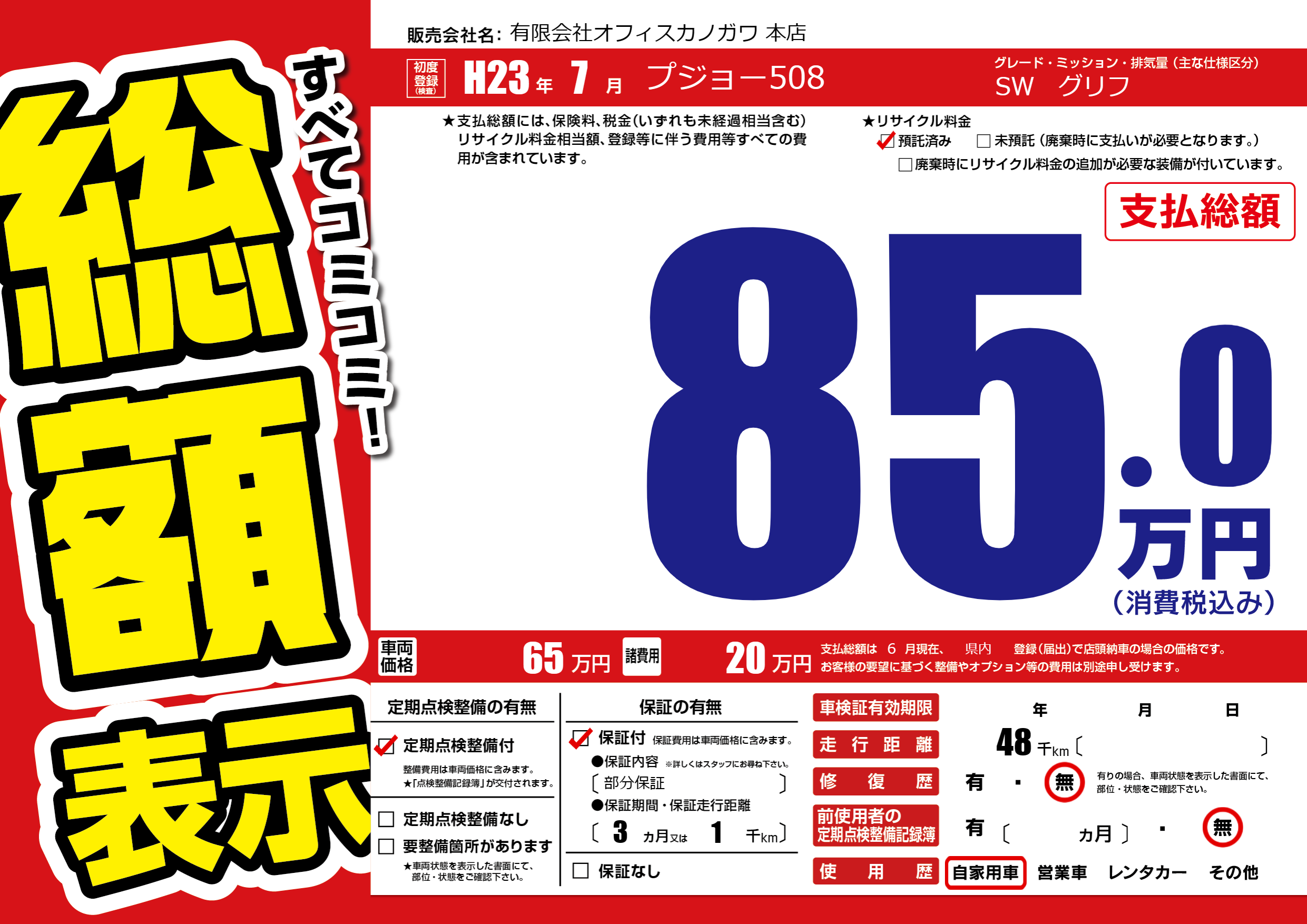 | 走行キロ | 4.8万km | 初年度登録 | H23年7月 |