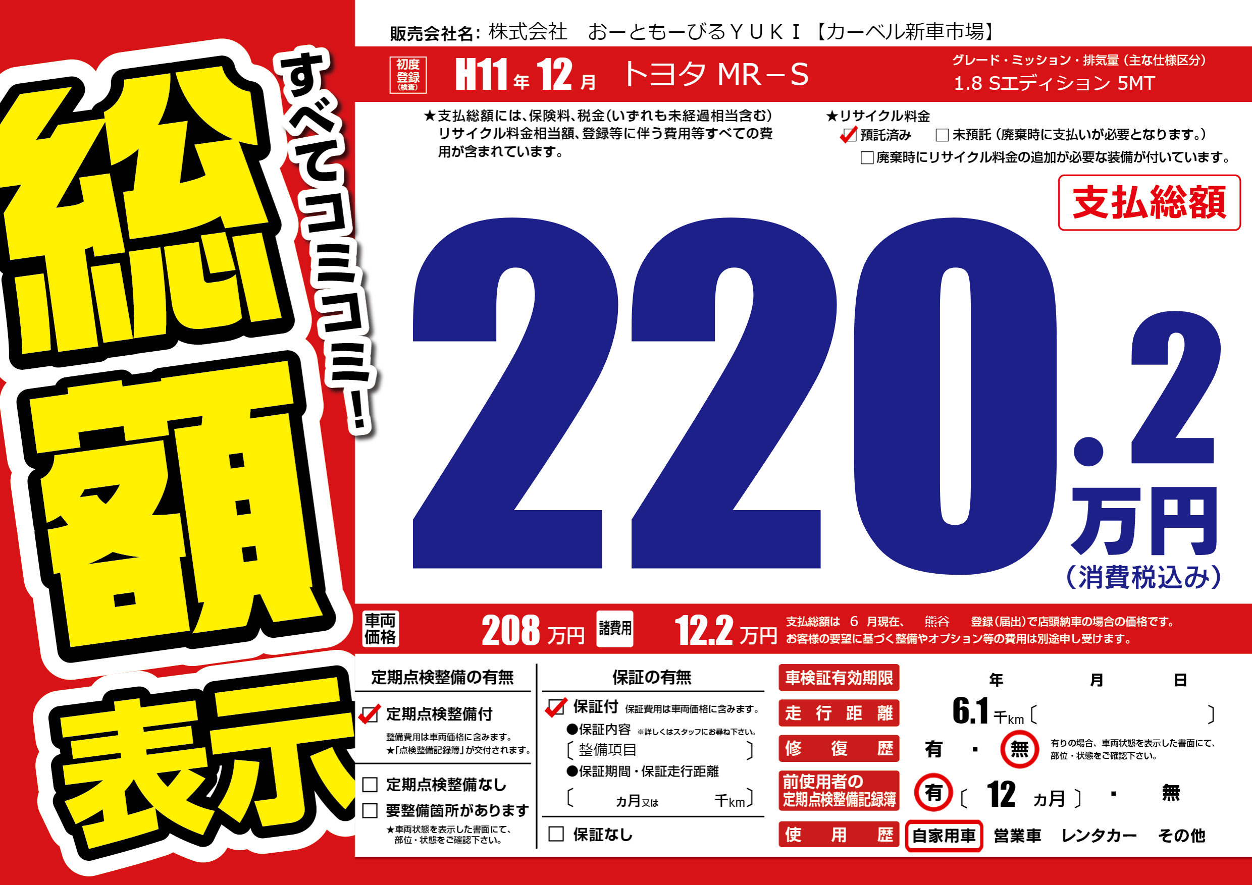 | 走行キロ | 0.6万km | 初年度登録 | H11年12月 |