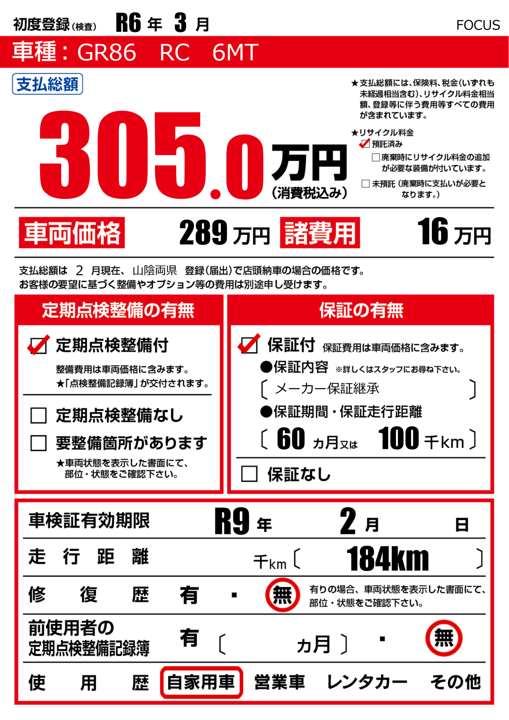 | 車検制限 | R9年 2月 - 日 | ||