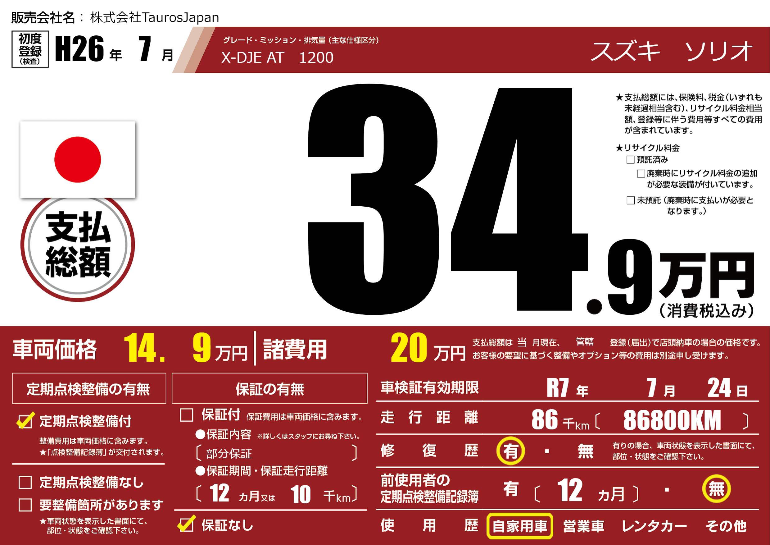 | 車名 | スズキ ソリオ | グレード ミッション 排気量 |