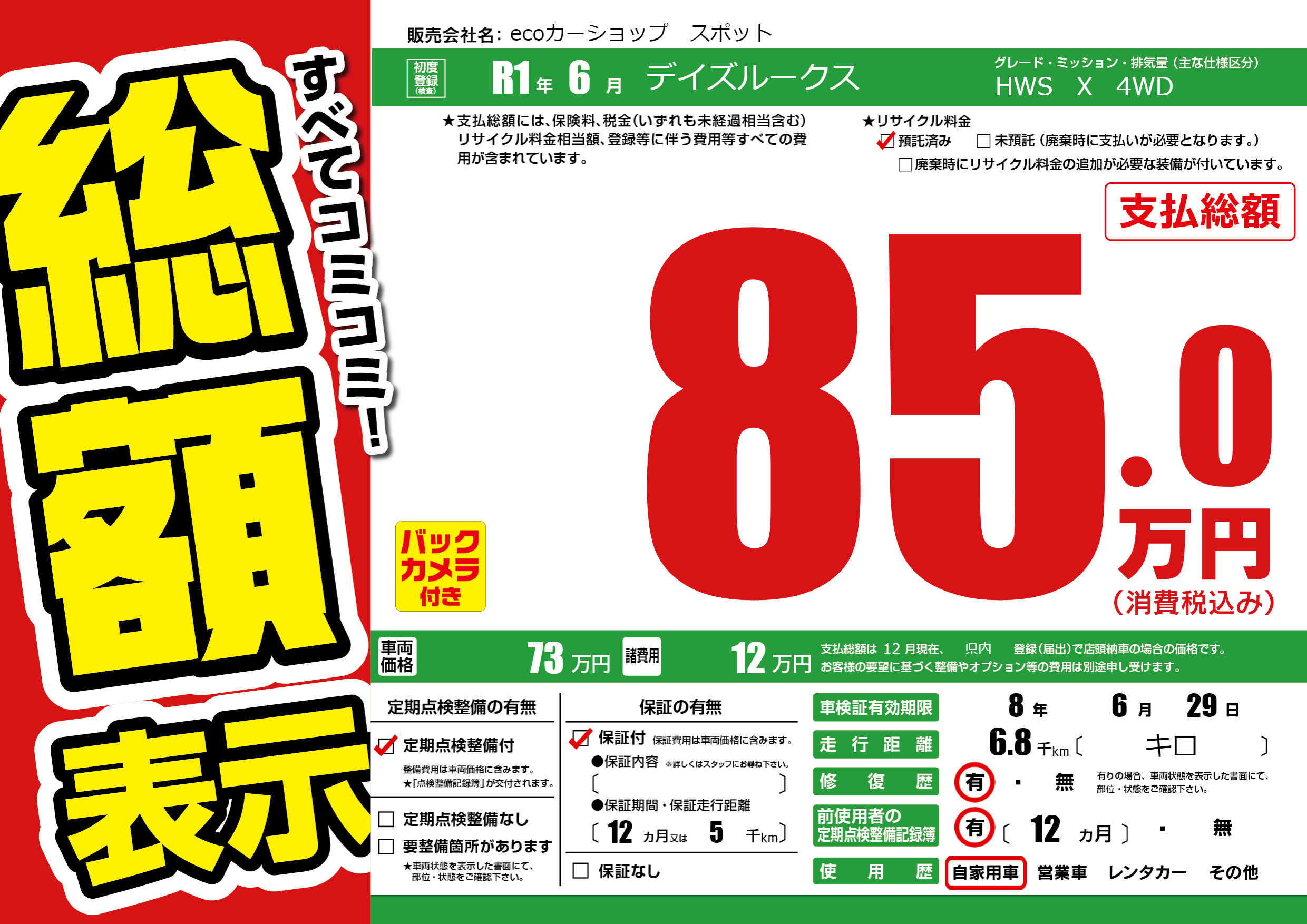 | 車名 | デイズルークス | グレード ミッション 排気量 |