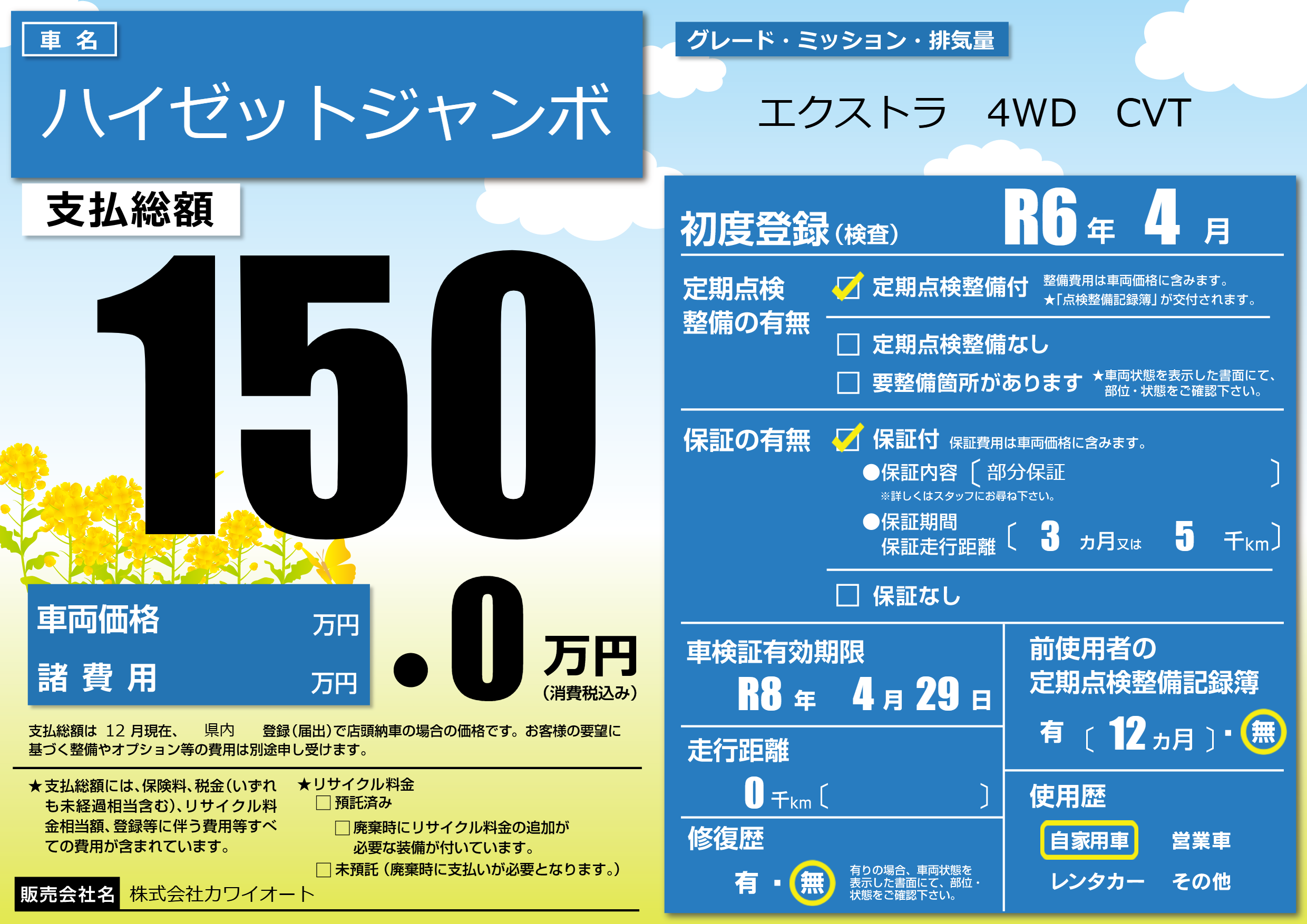 | 車名 | ハイゼットジャンボ | グレード ミッション 排気量 |