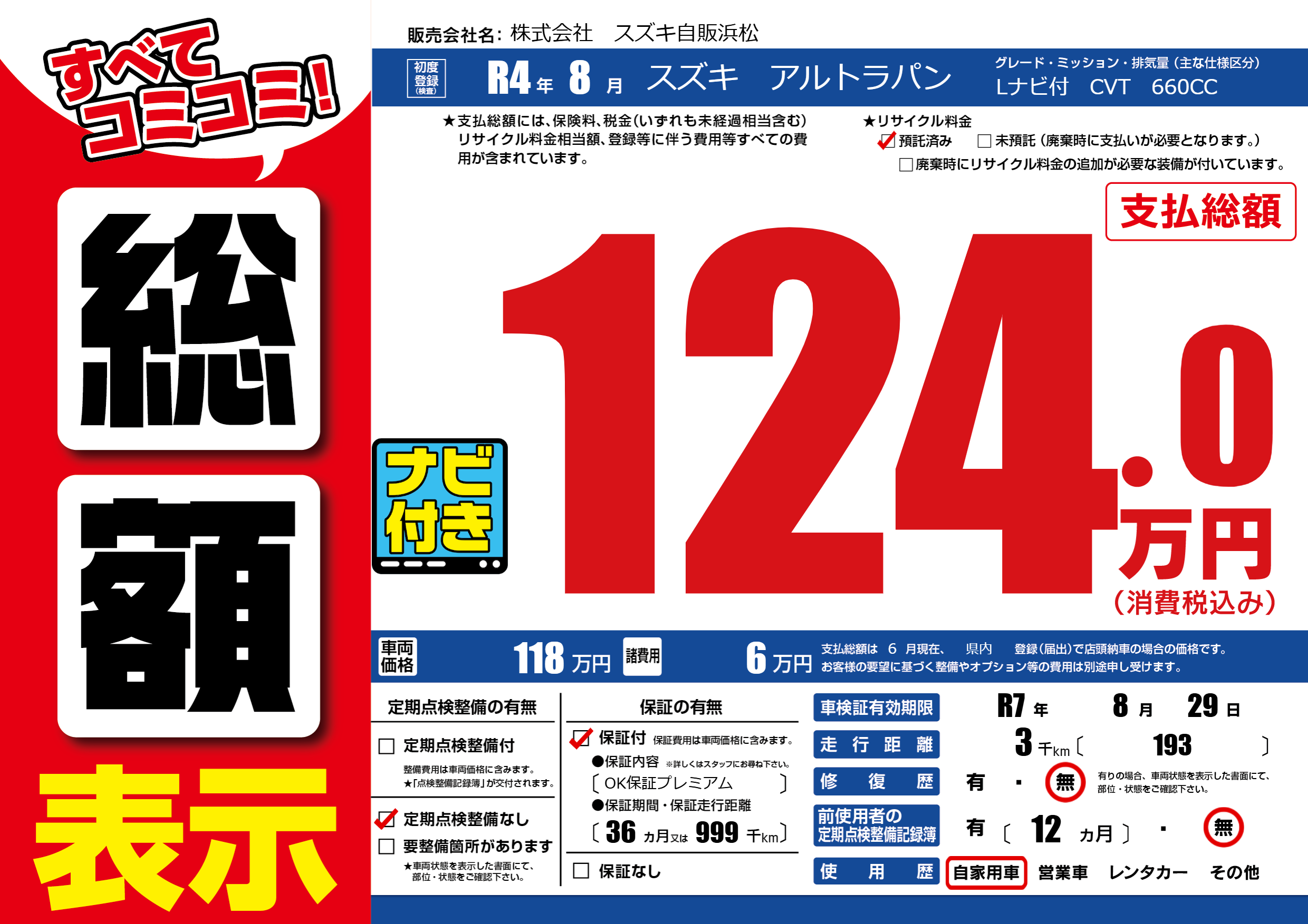 | 走行キロ | 0.3万km | 初年度登録 | R4年8月 |