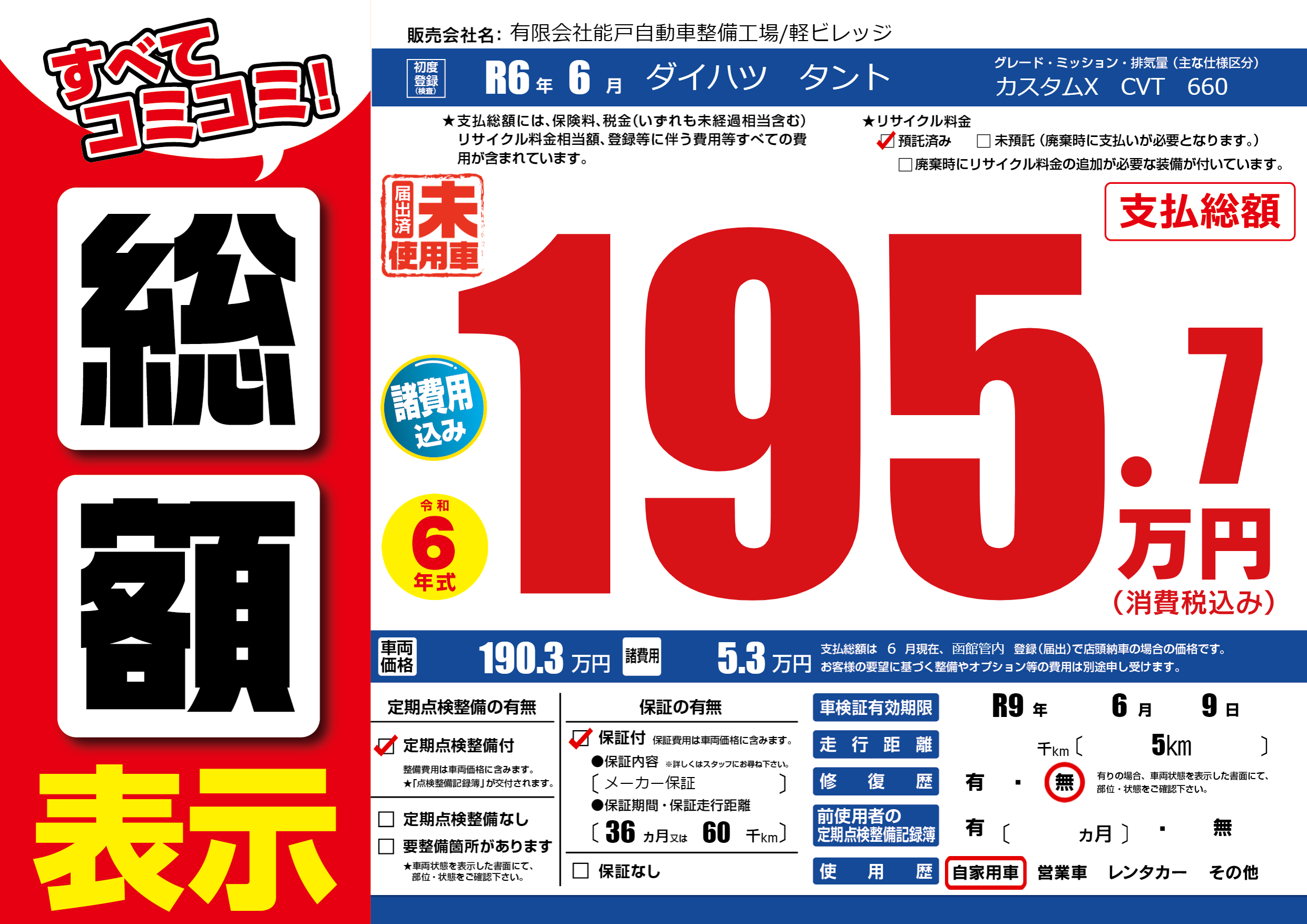 | 車名 | ダイハツ タント | グレード ミッション 排気量 |