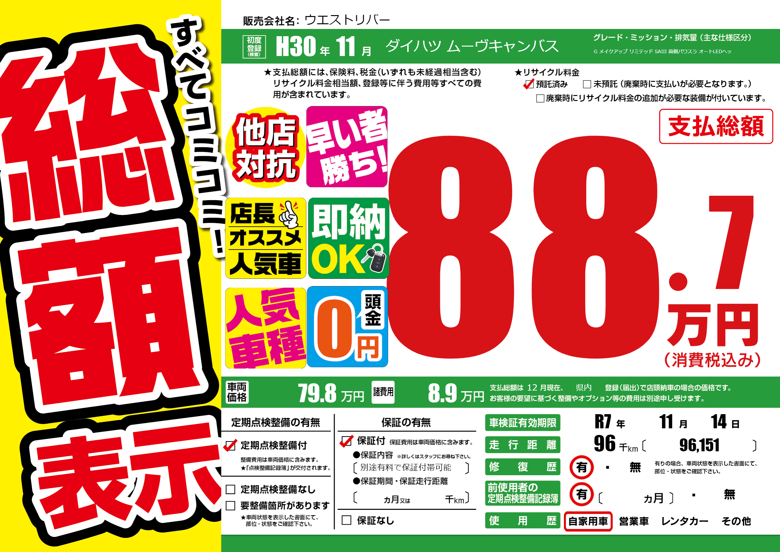| 走行キロ | 9.6万km | 初年度登録 | H30年11月 |