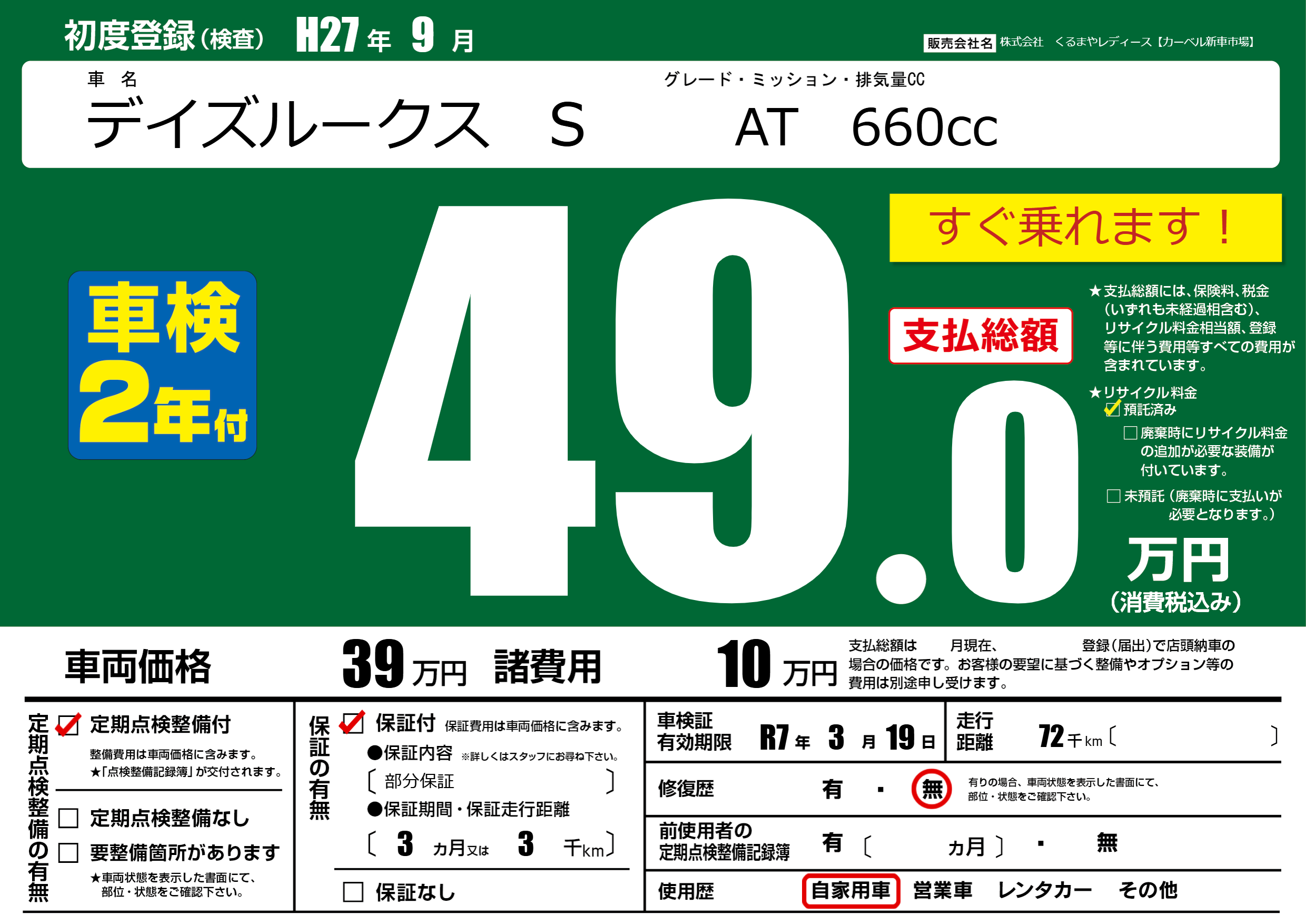 | 車名 | デイズルークス S | グレード ミッション 排気量 |