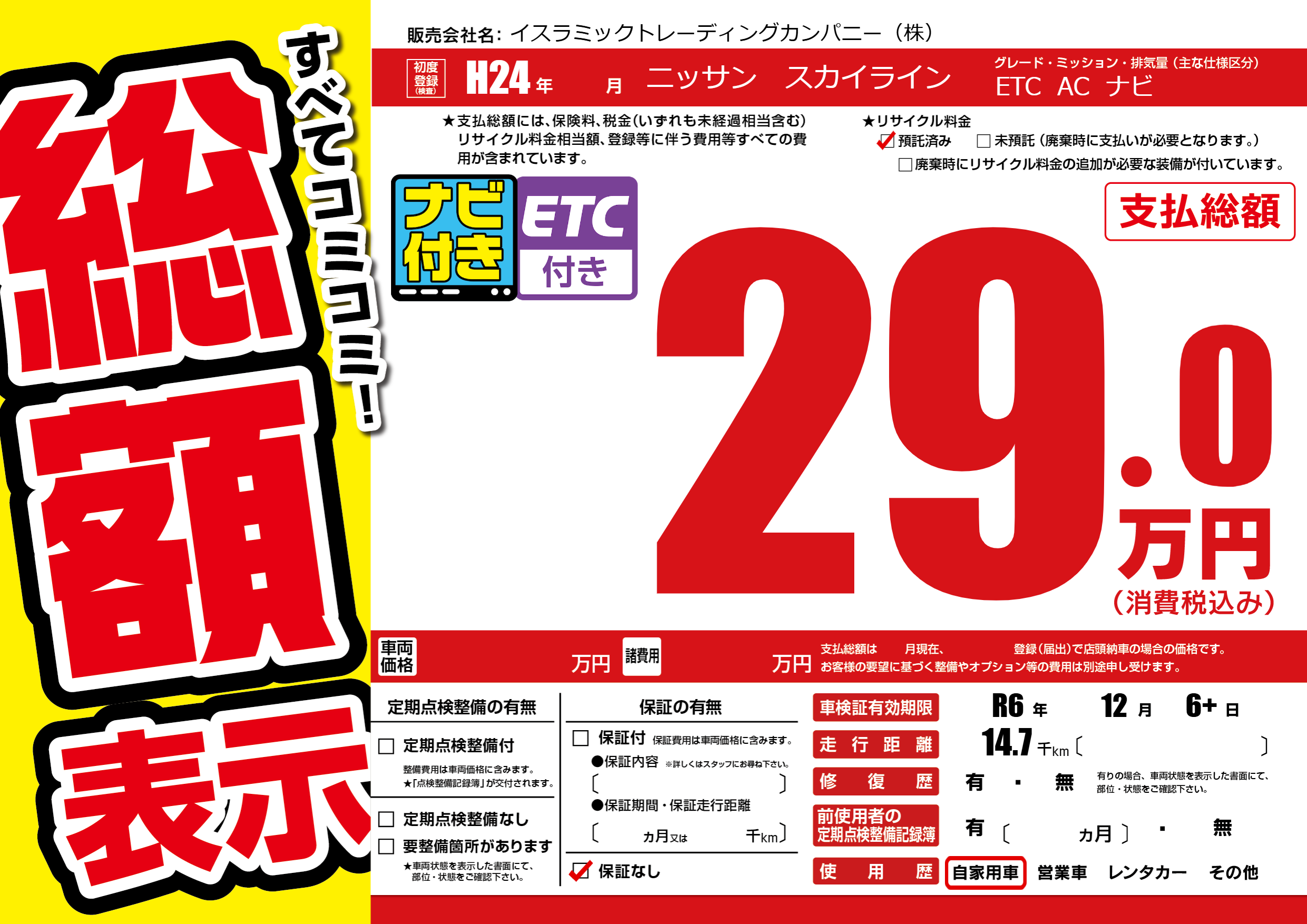| 車名 | ニッサン スカイライン | グレード ミッション 排気量 |
