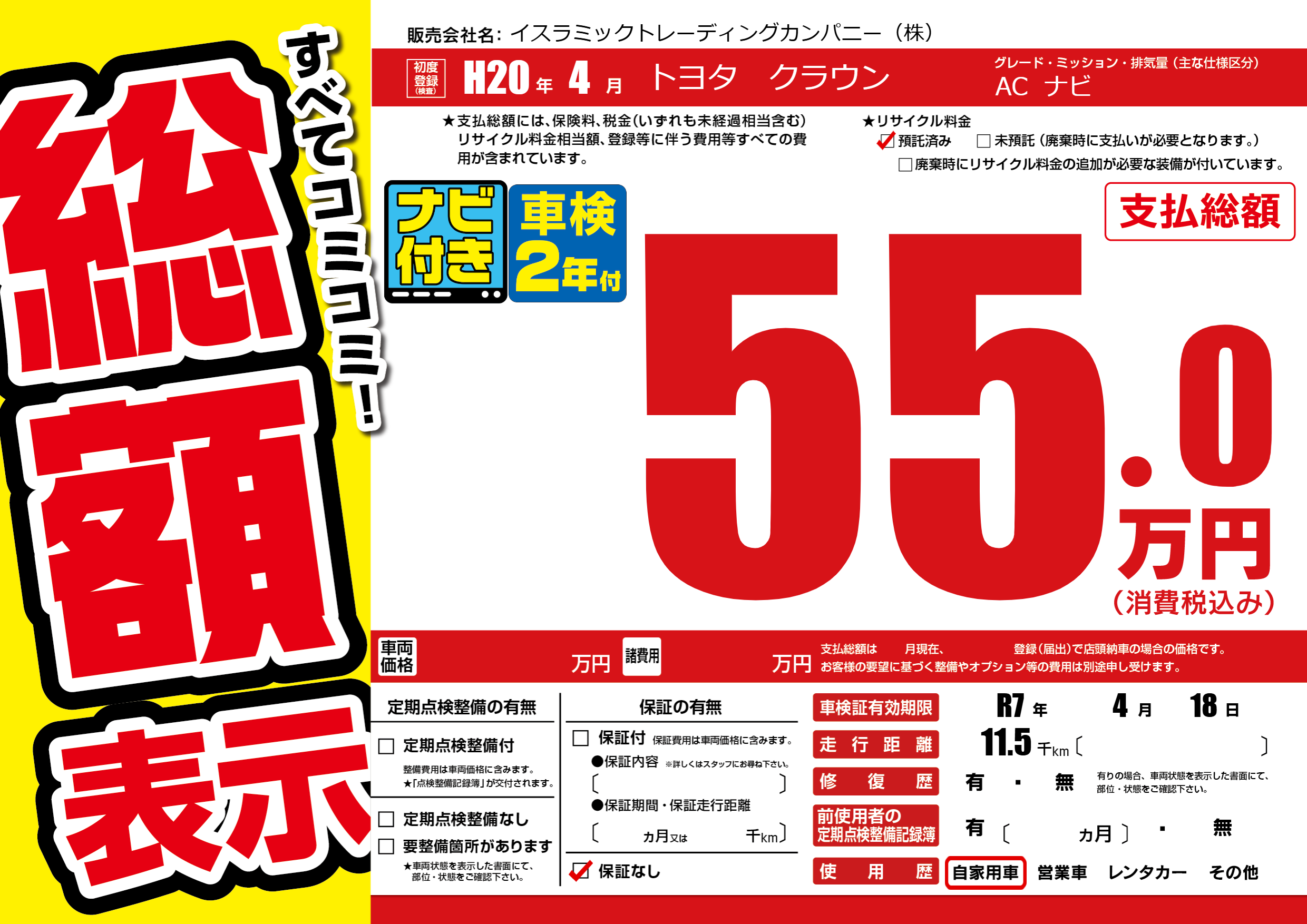 | 車名 | トヨタ クラウン | グレード ミッション 排気量 |