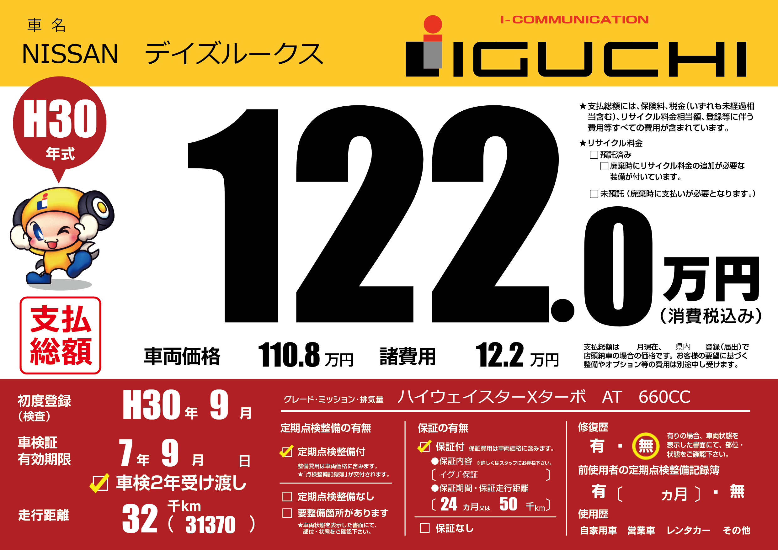 保証付き 保証内容(イグチ保証) 24ヶ月または(50)千kmまで |