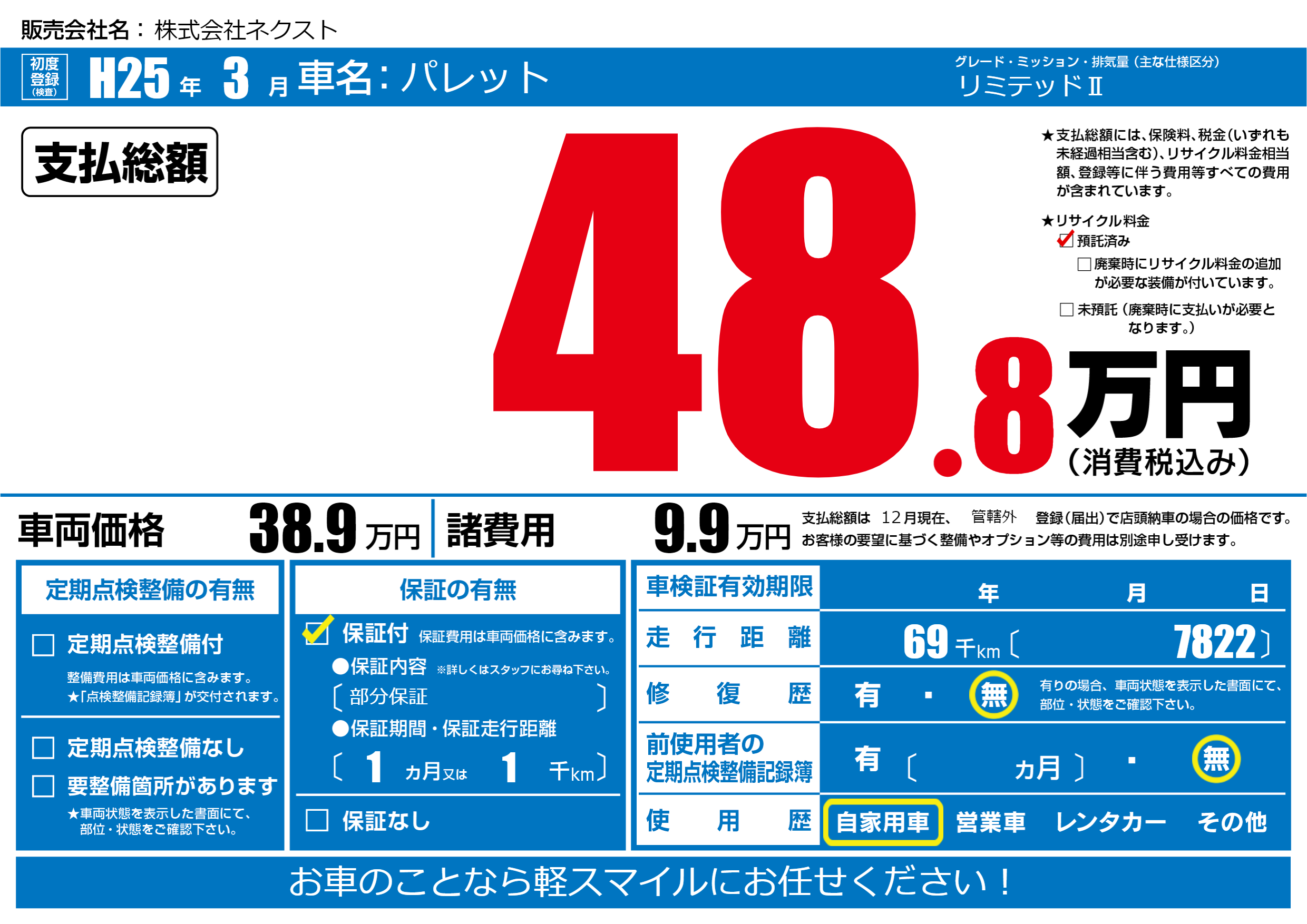 | 走行キロ | 6.9万km | 初年度登録 | H25年3月 |