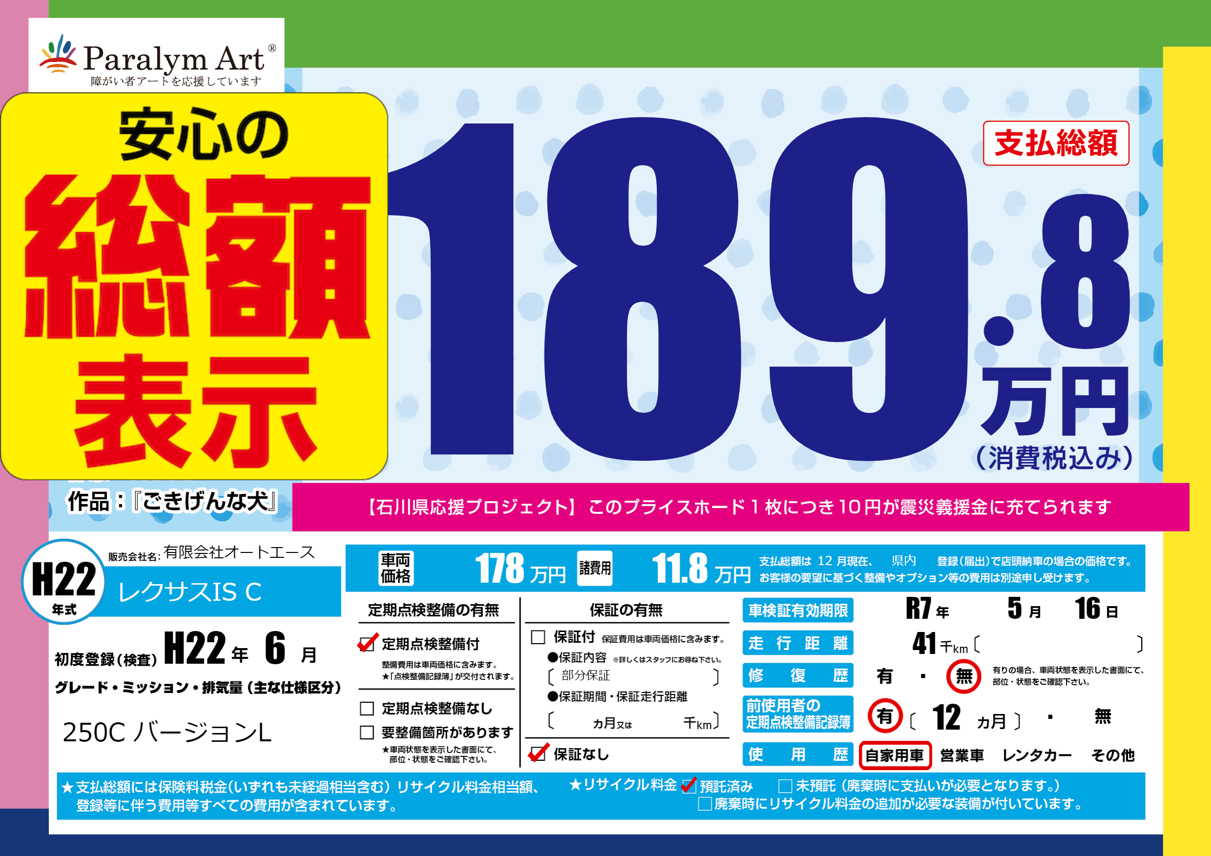 | 車名 | レクサスIS C | グレード ミッション 排気量 |