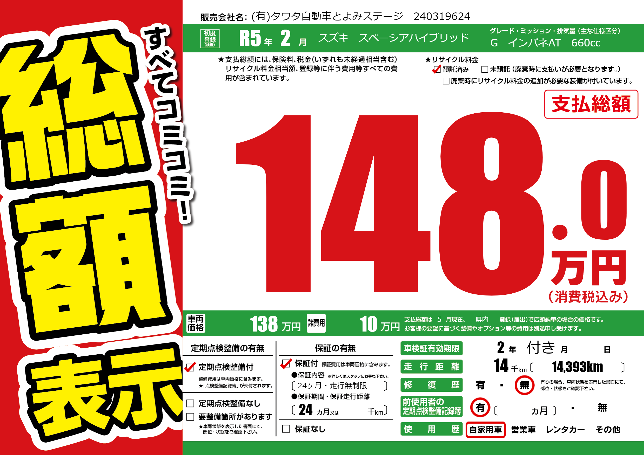 | 車名 | スズキ スペーシアハイブリッド | グレード ミッション 排気量 |