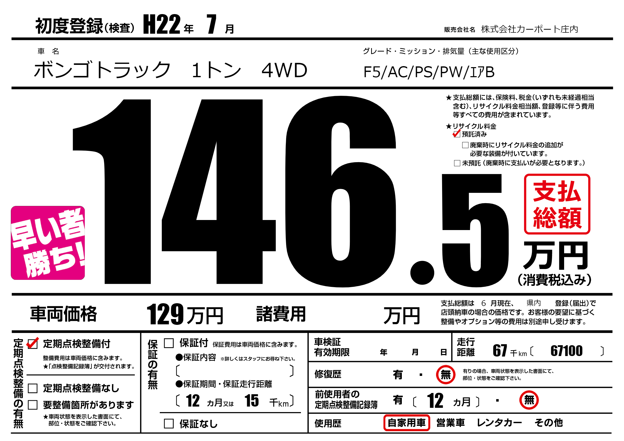 | 走行キロ | 6.7万km | 初年度登録 | H22年7月 |
