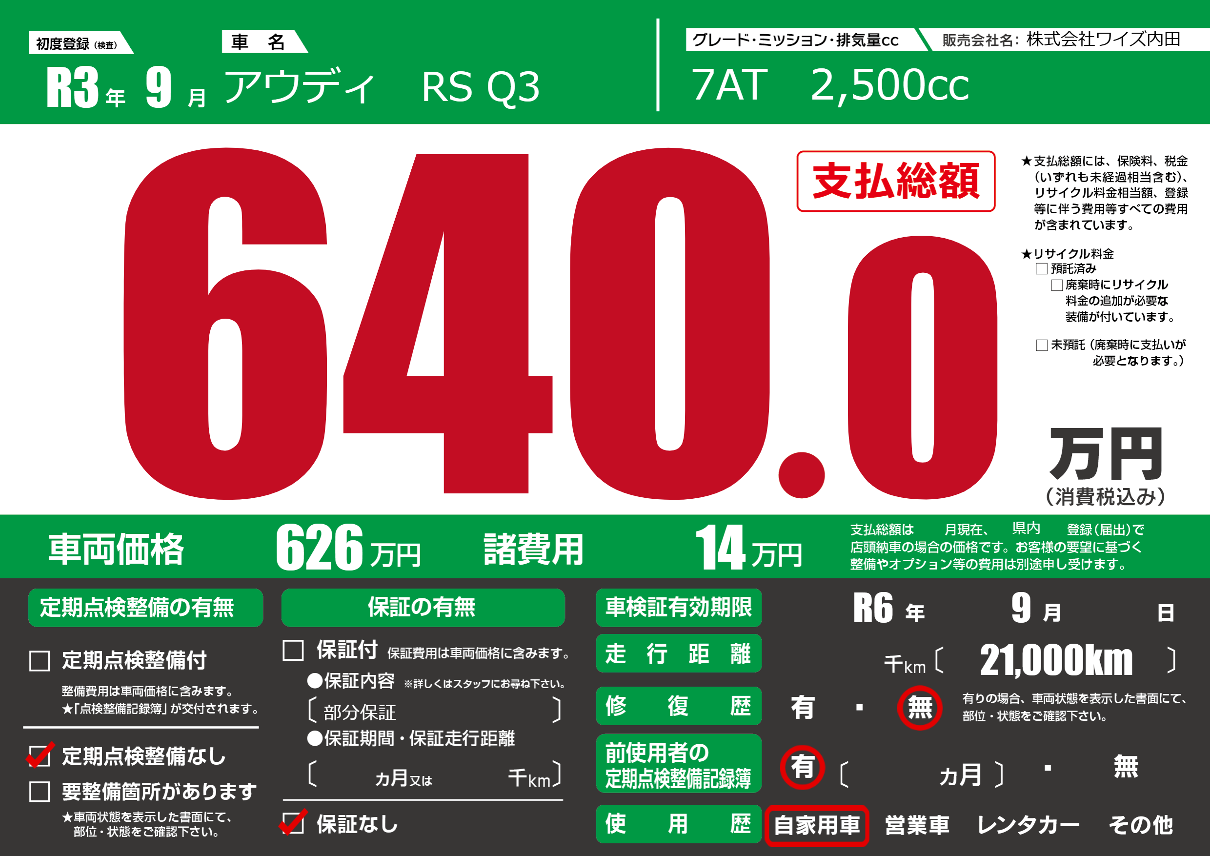 | 走行キロ | - | 初年度登録 | R3年9月 |