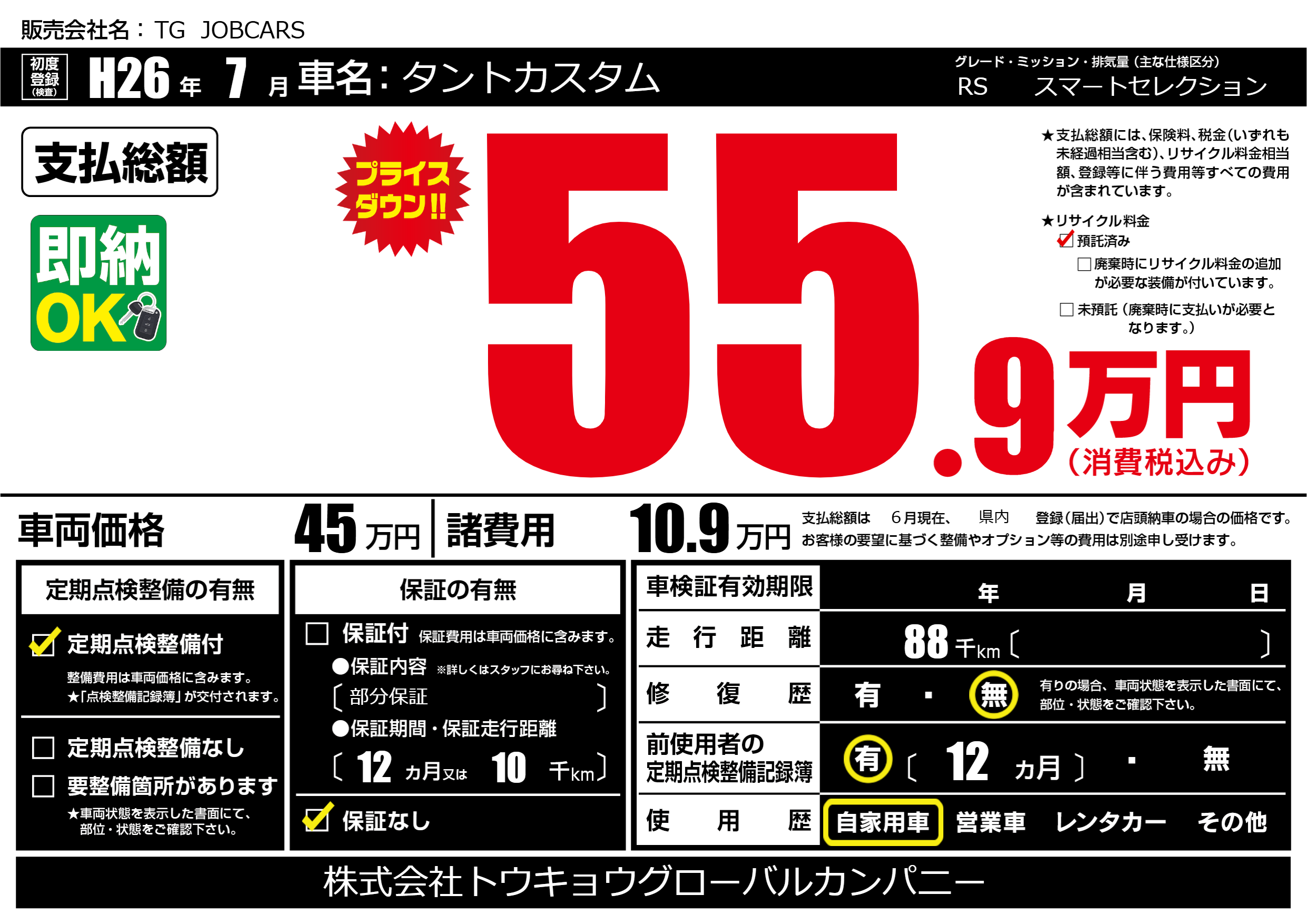 | 走行キロ | 8.8万km | 初年度登録 | H26年7月 |
