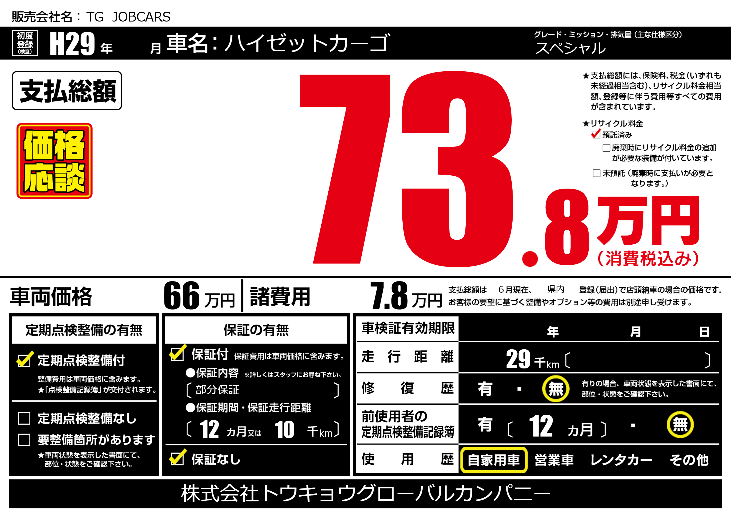 | 走行キロ | 2.9万km | 初年度登録 | H29年---月 |