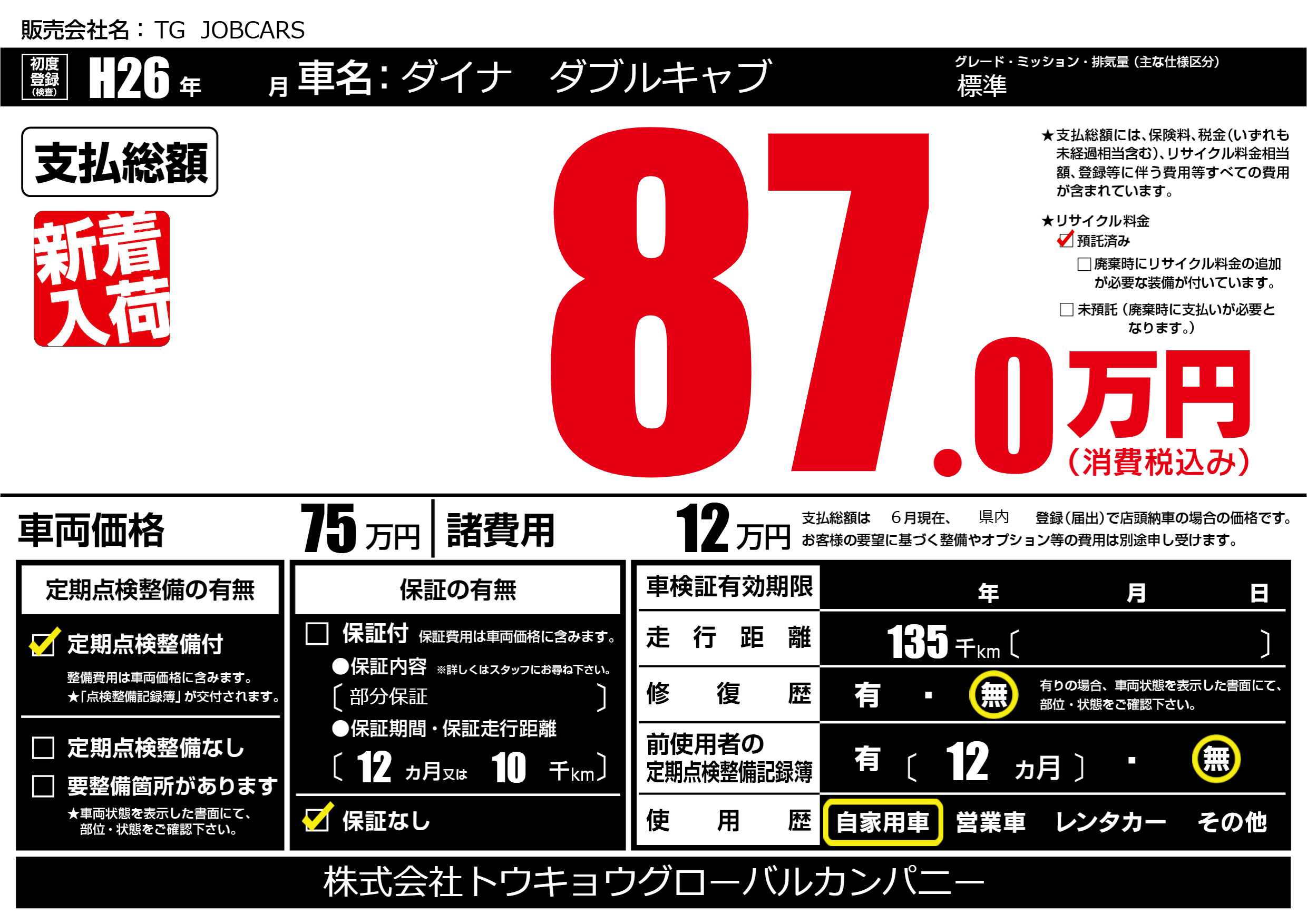 | 車名 | ダイナ ダブルキャブ | グレード ミッション 排気量 |