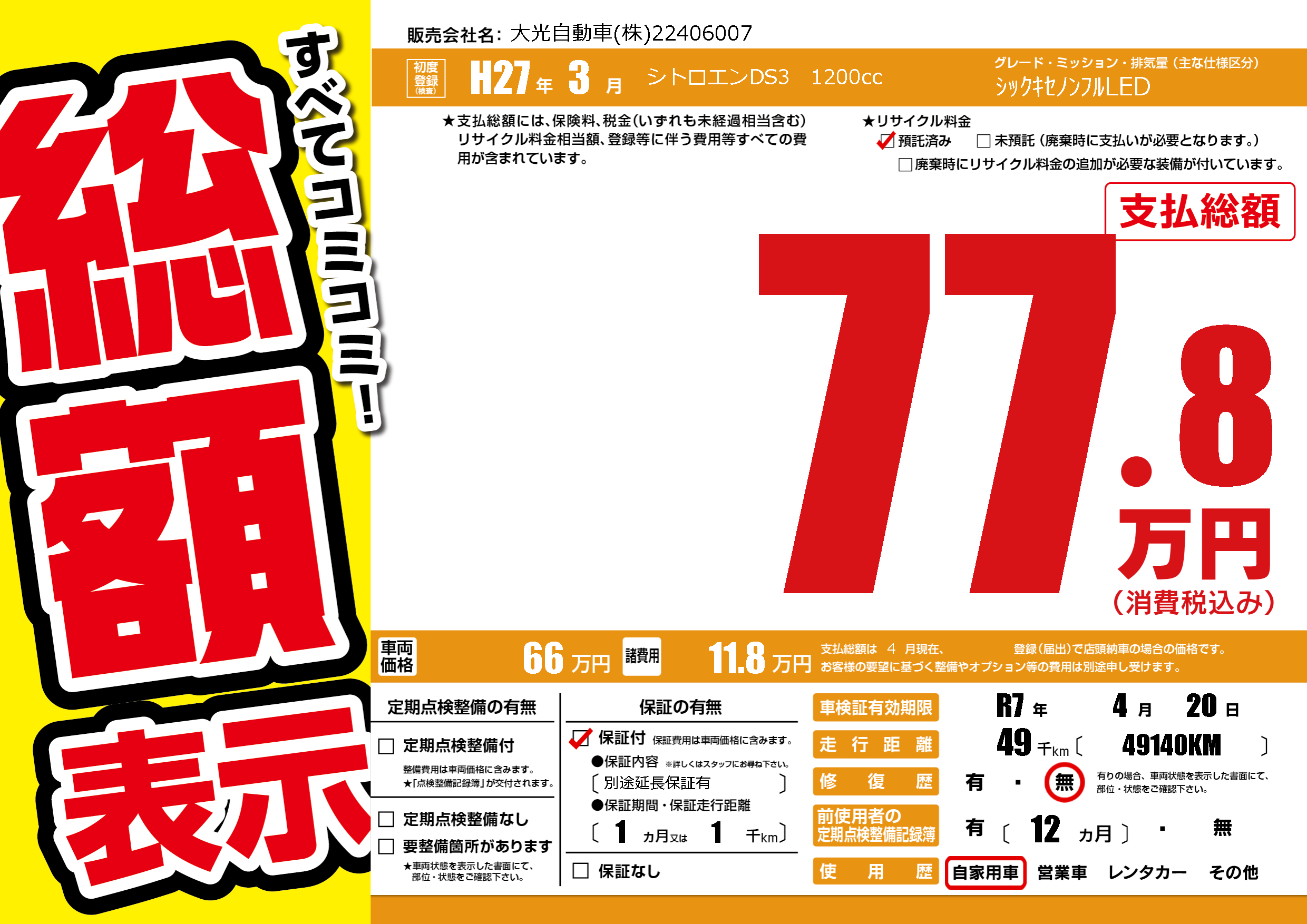 | 車名 | シトロエンDS3 1200cc | グレード ミッション 排気量 |