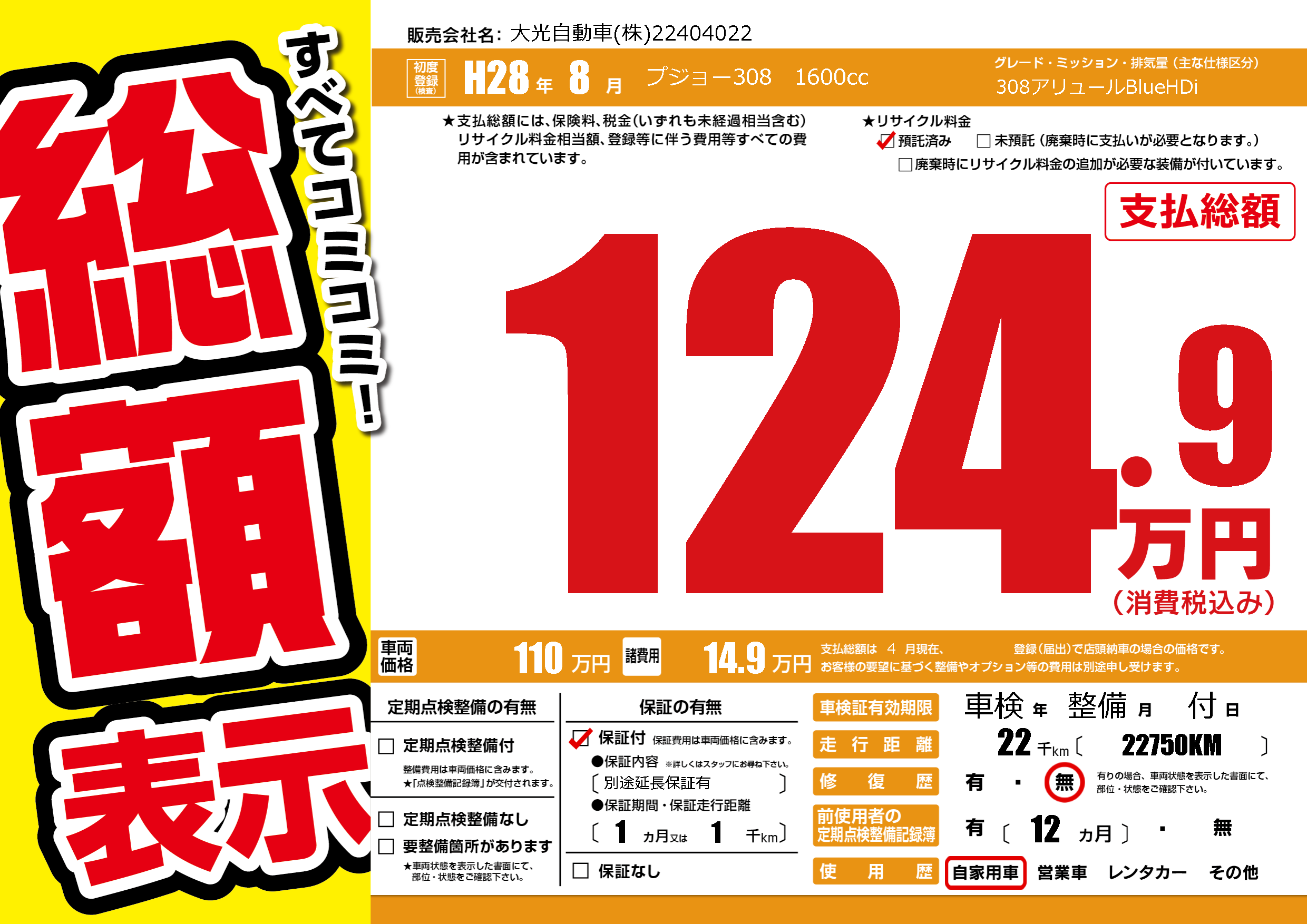| 車名 | プジョー308 1600cc | グレード ミッション 排気量 |
