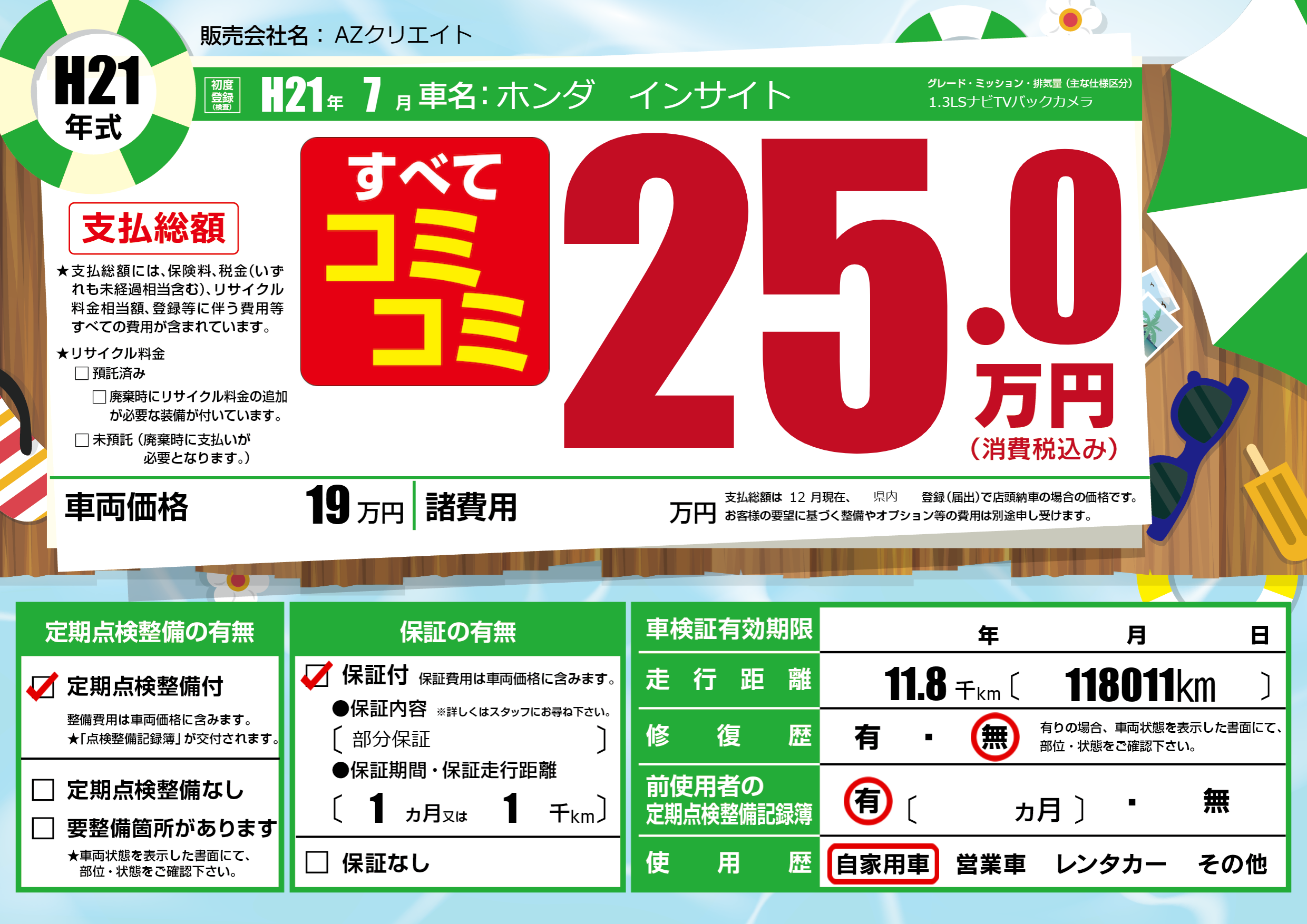 | 走行キロ | 1.1万km | 初年度登録 | H21年7月 |