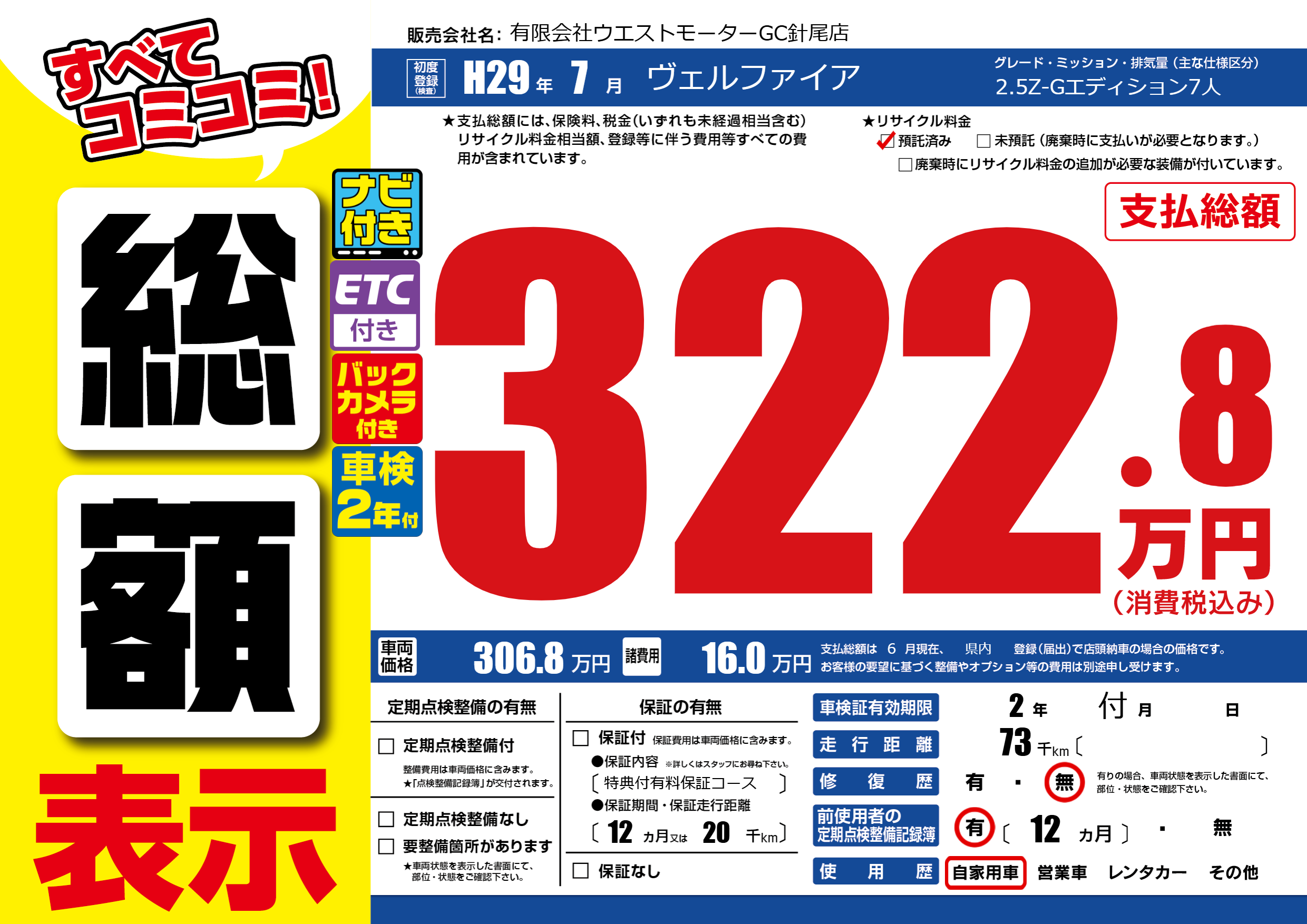 | 走行キロ | 7.3万km | 初年度登録 | H29年7月 |