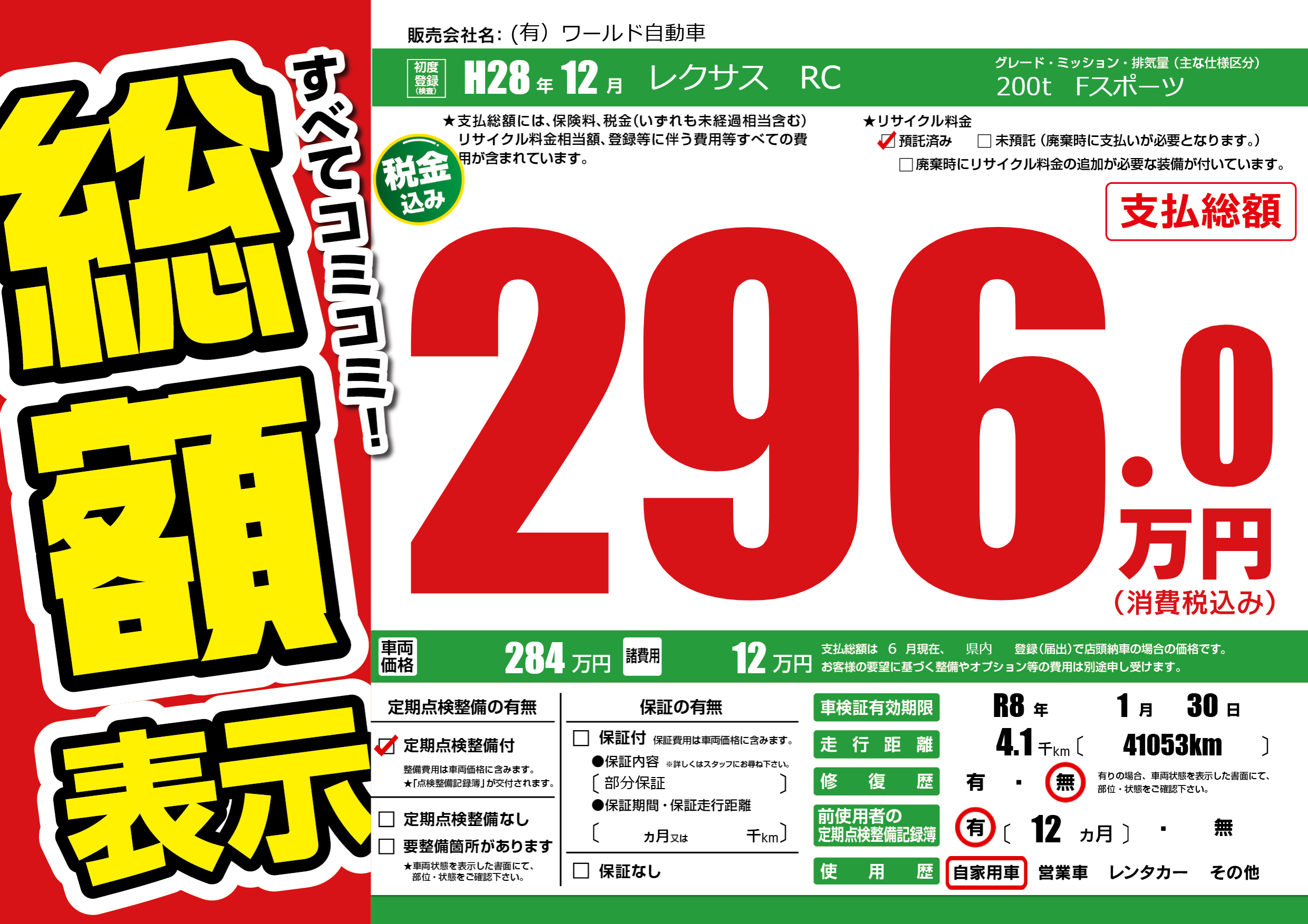 | 車名 | レクサス RC | グレード ミッション 排気量 |