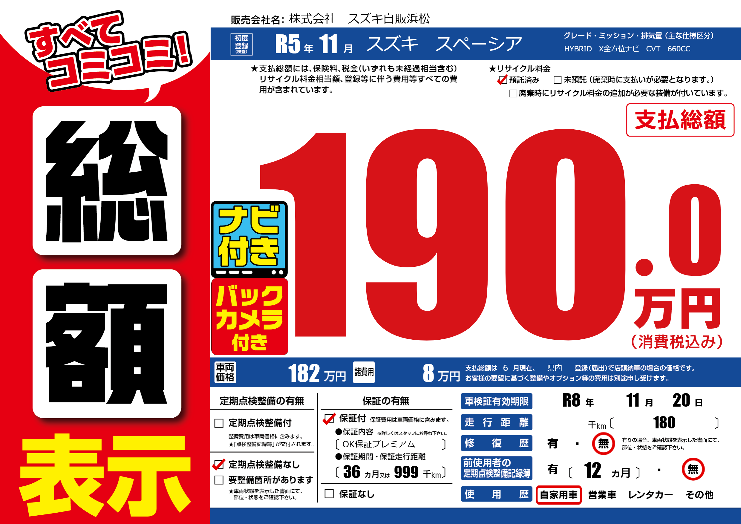 | 車名 | スズキ スペーシア | グレード ミッション 排気量 |