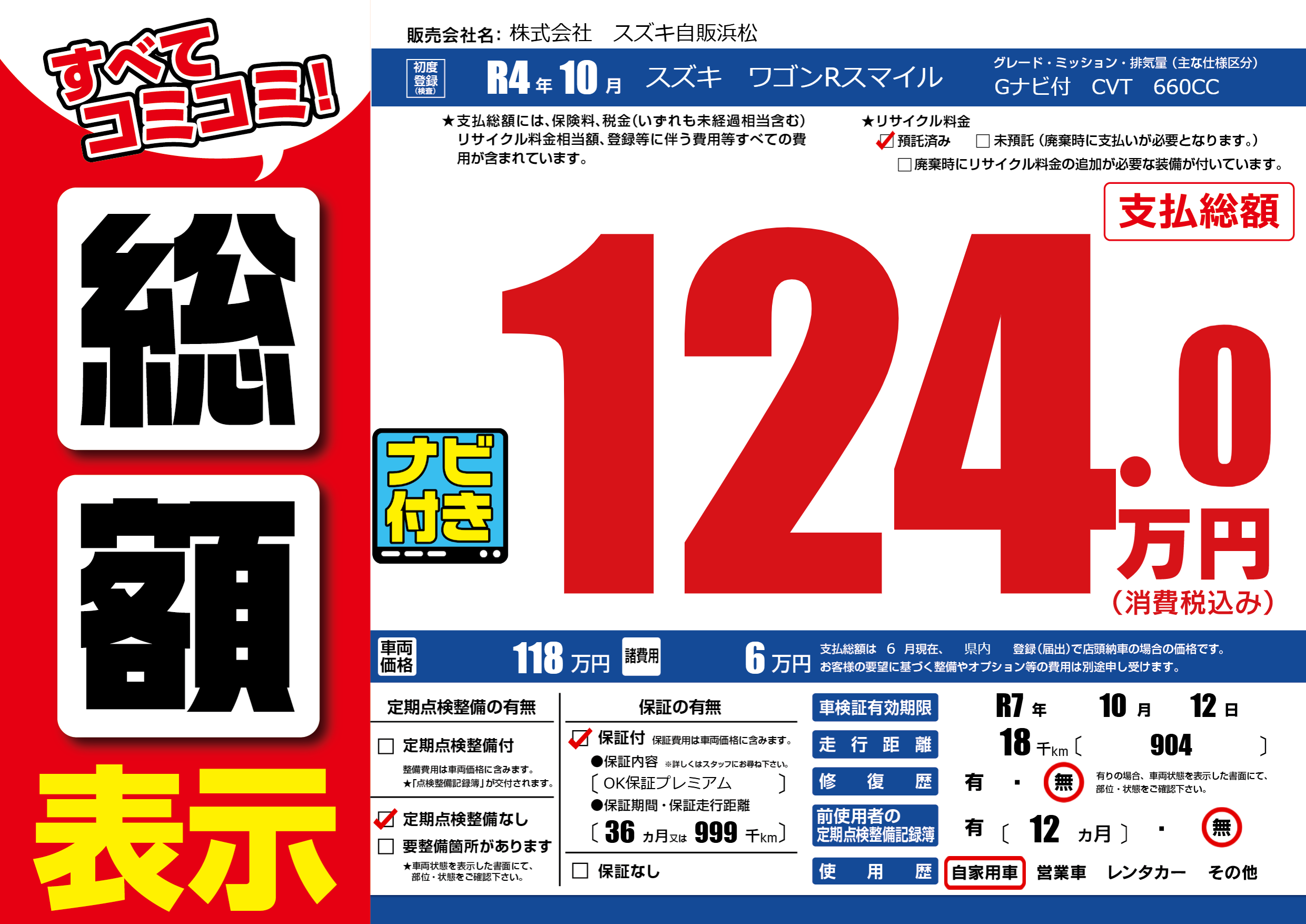 | 車名 | スズキ ワゴンRスマイル | グレード ミッション 排気量 |