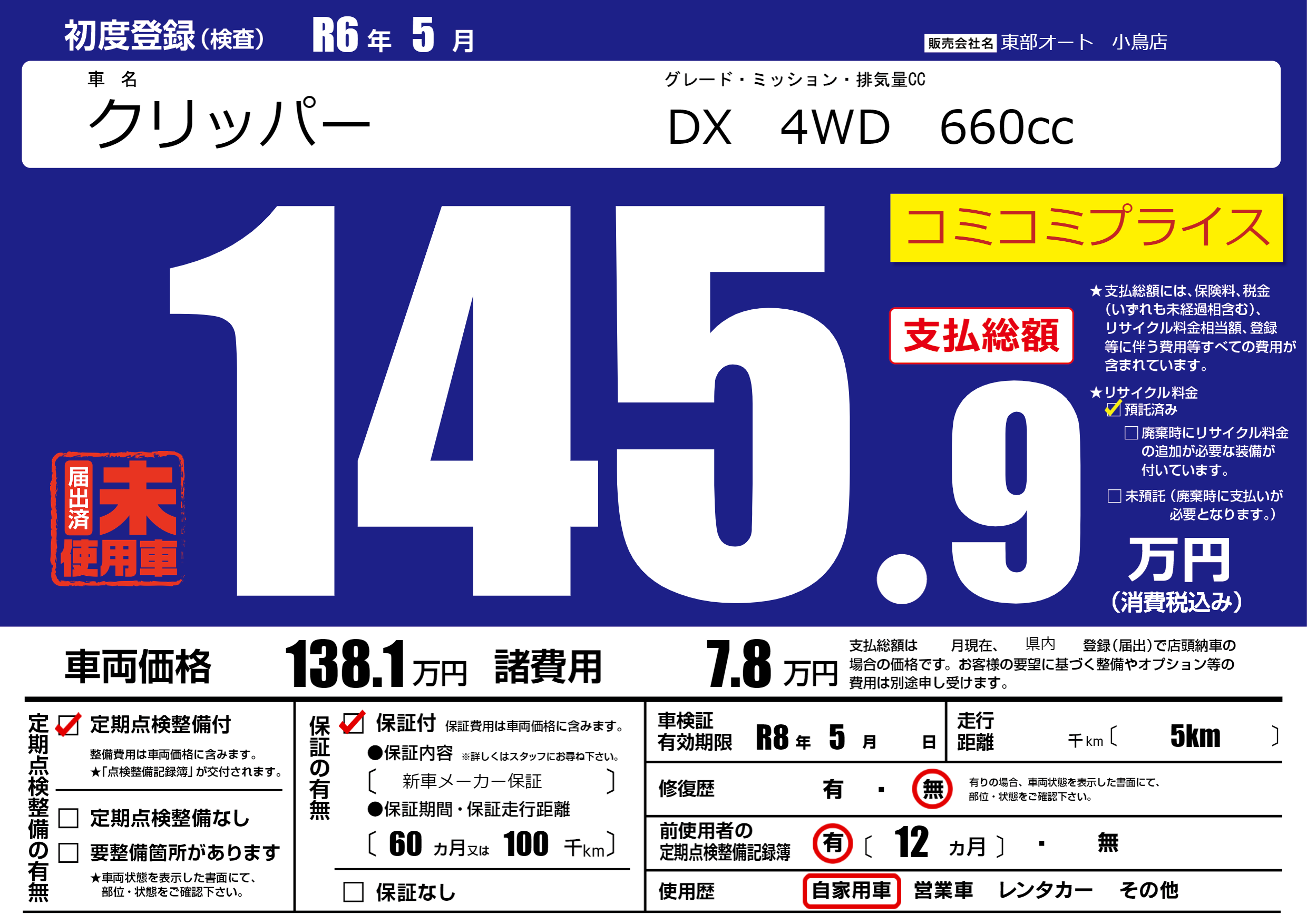 保証付き 保証内容( 新車メーカー保証) 60ヶ月または(100)千kmまで |