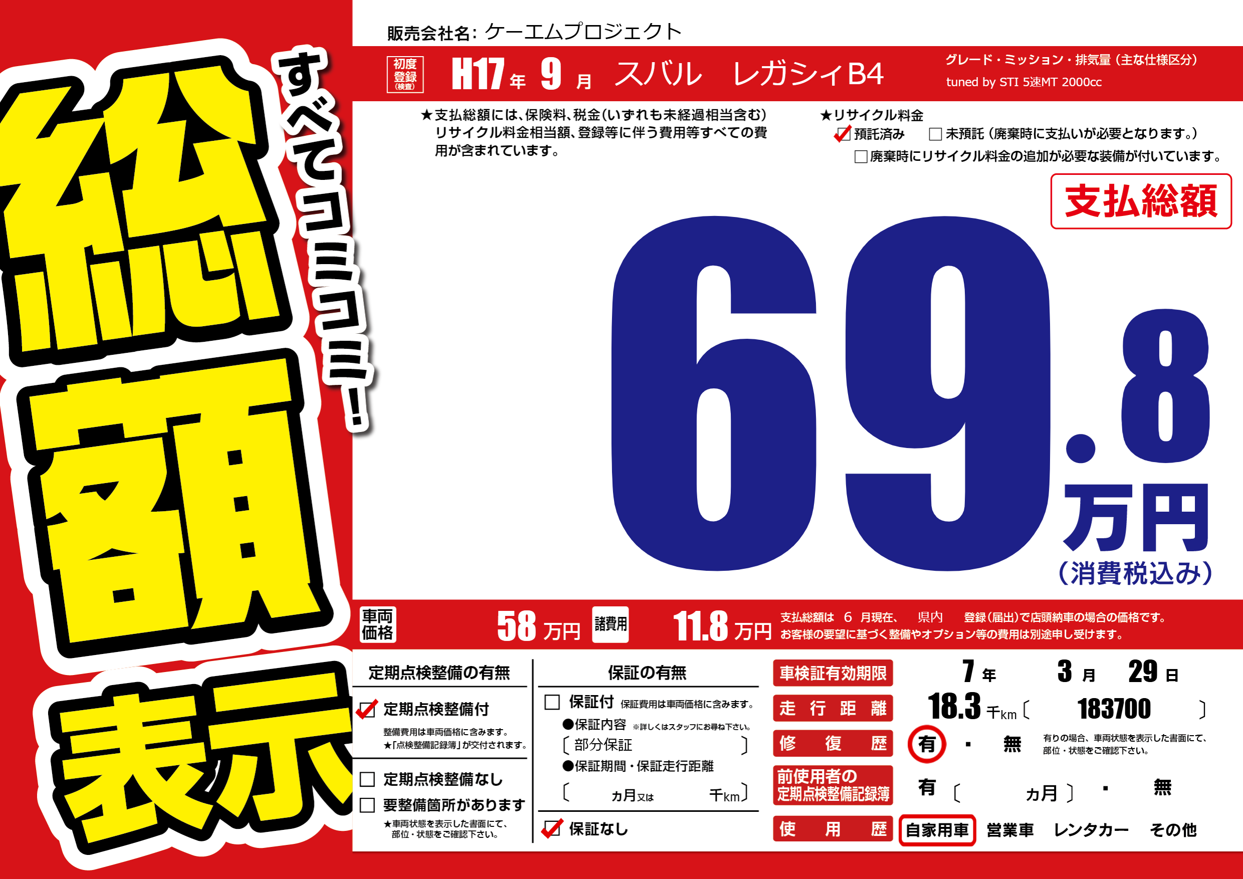| 車名 | スバル レガシィB4 | グレード ミッション 排気量 |