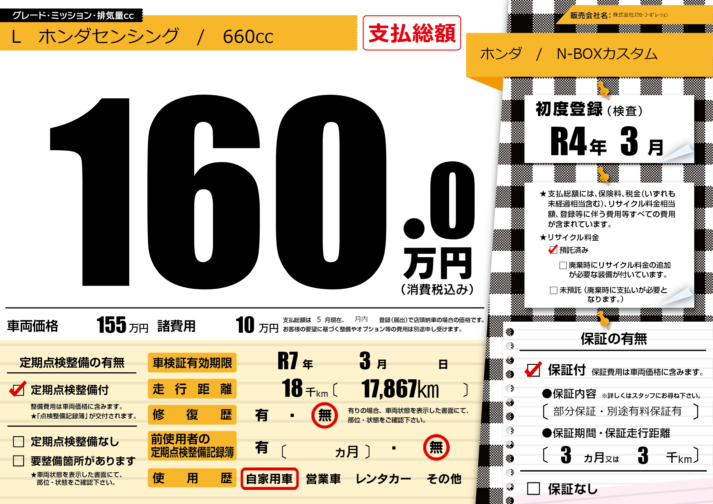 保証付き 保証内容(部分保証・別途有料保証有) 3ヶ月または3千km |