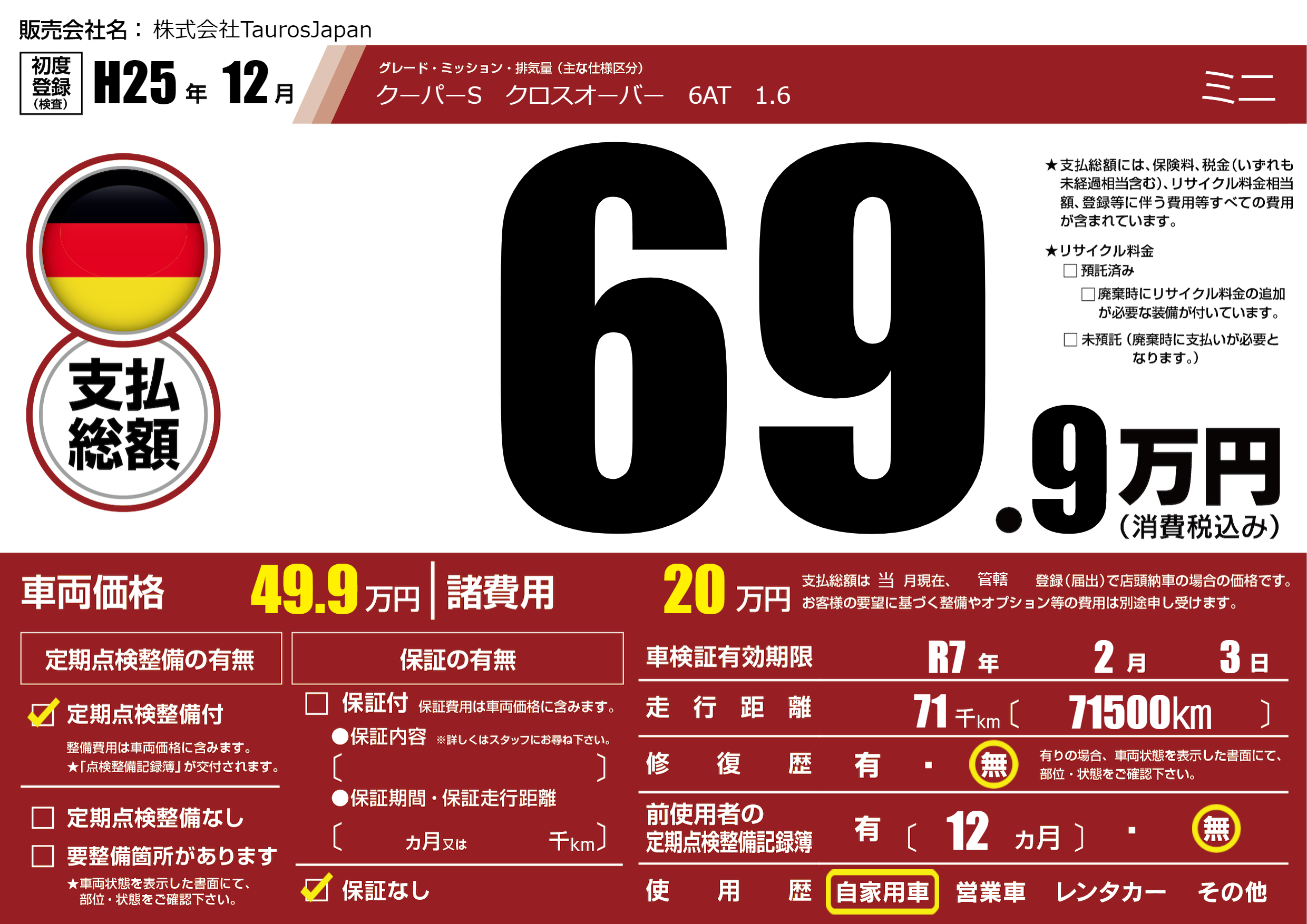| 走行キロ | 7.1万km | 初年度登録 | H25年12月 |