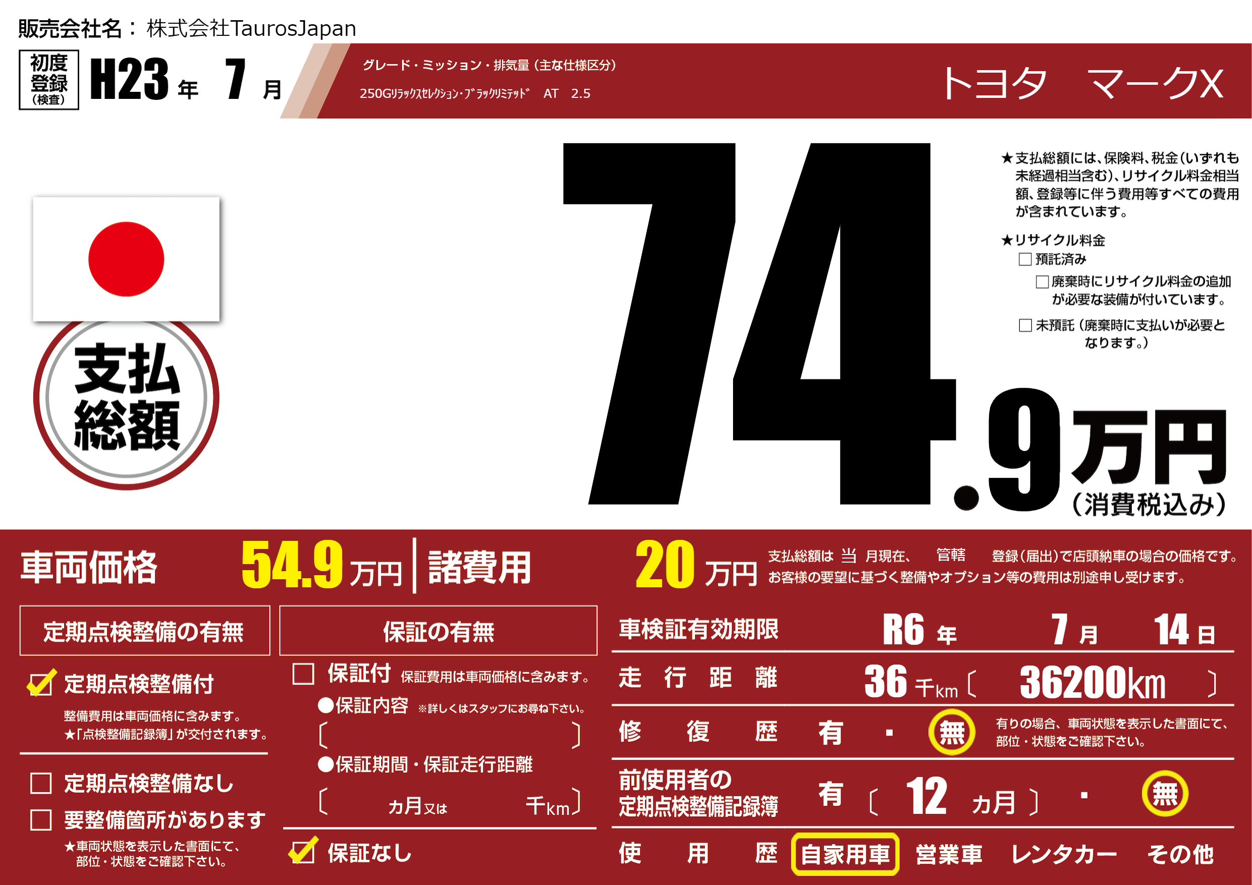 | 車名 | トヨタ マークX | グレード ミッション 排気量 |