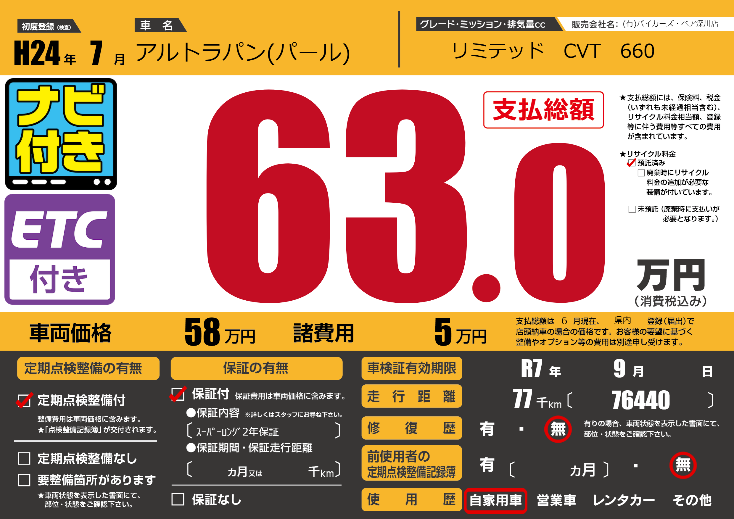 | 走行キロ | 7.7万km | 初年度登録 | H24年7月 |