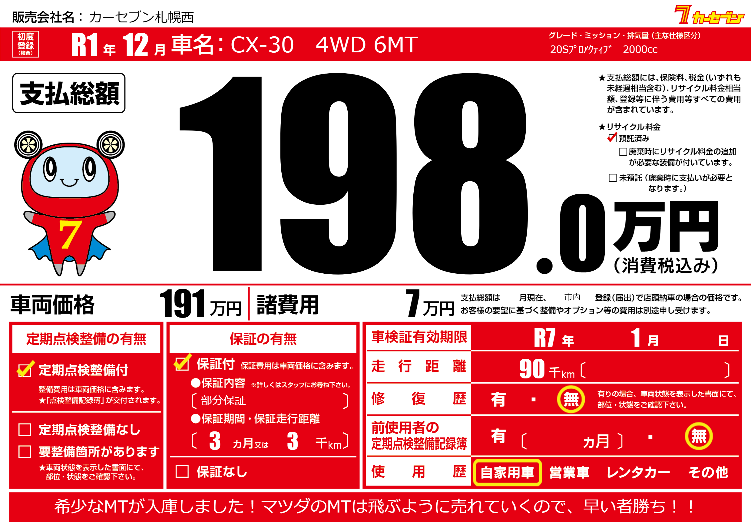 | 車名 | CX-30 4WD 6MT | グレード ミッション 排気量 |