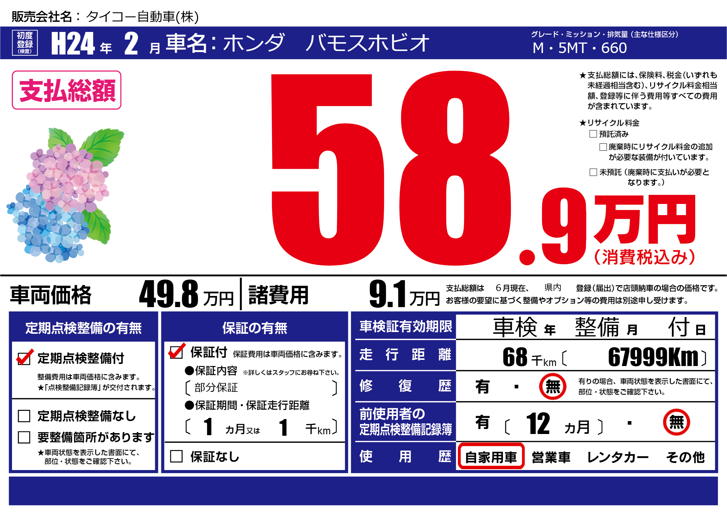 | 車名 | ホンダ バモスホビオ | グレード ミッション 排気量 |