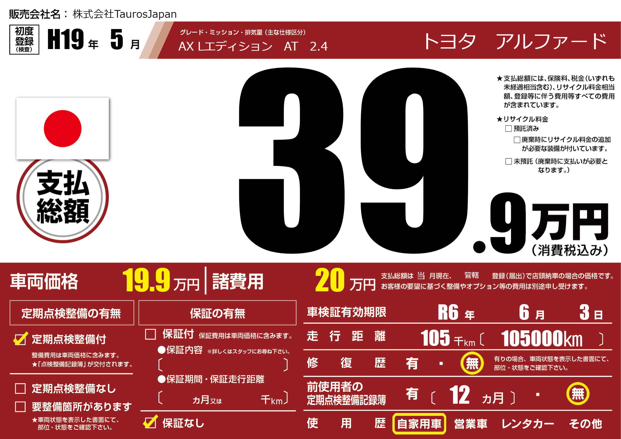 | 車名 | トヨタ アルファード | グレード ミッション 排気量 |