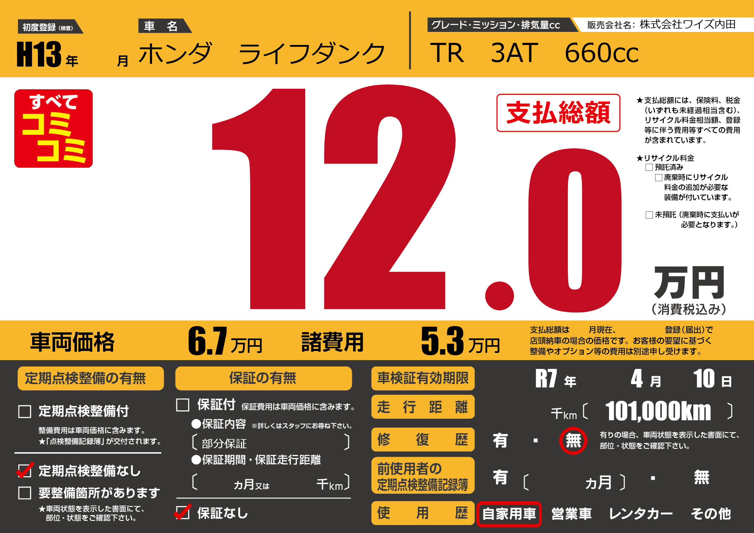 | 車名 | ホンダ ライフダンク | グレード ミッション 排気量 |