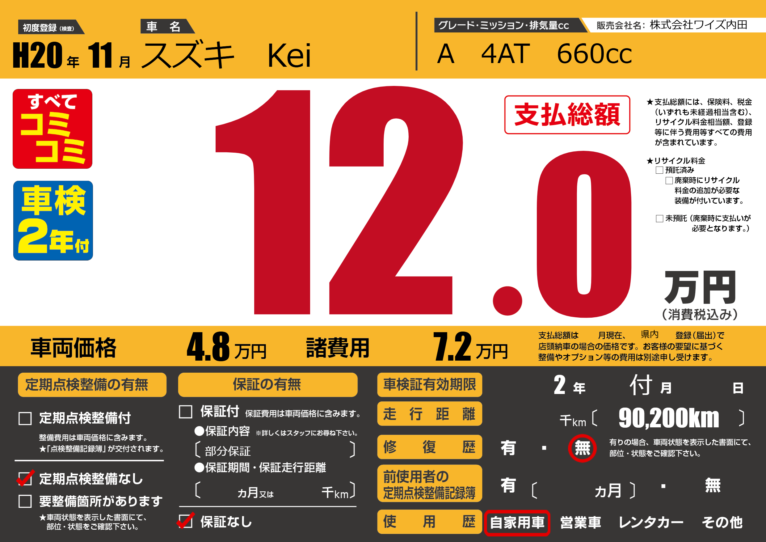 | 車名 | スズキ Kei | グレード ミッション 排気量 |