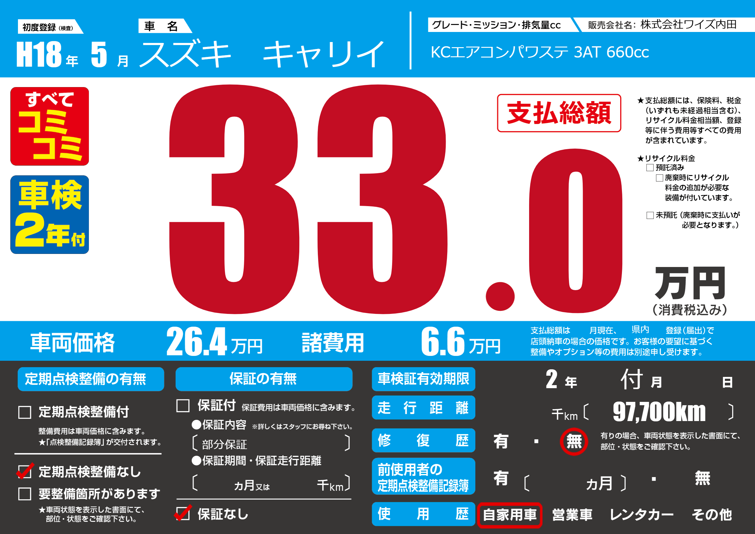 保証なし 保証内容(部分保証) ---ヶ月または()千kmまで |
