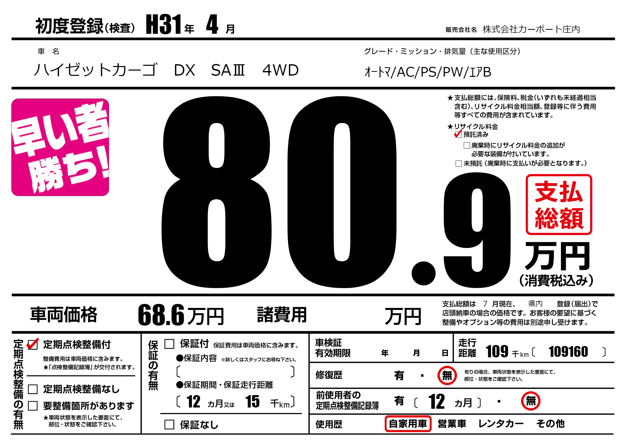 | 車名 | ハイゼットカーゴ DX SAⅢ 4WD | グレード ミッション 排気量 |
