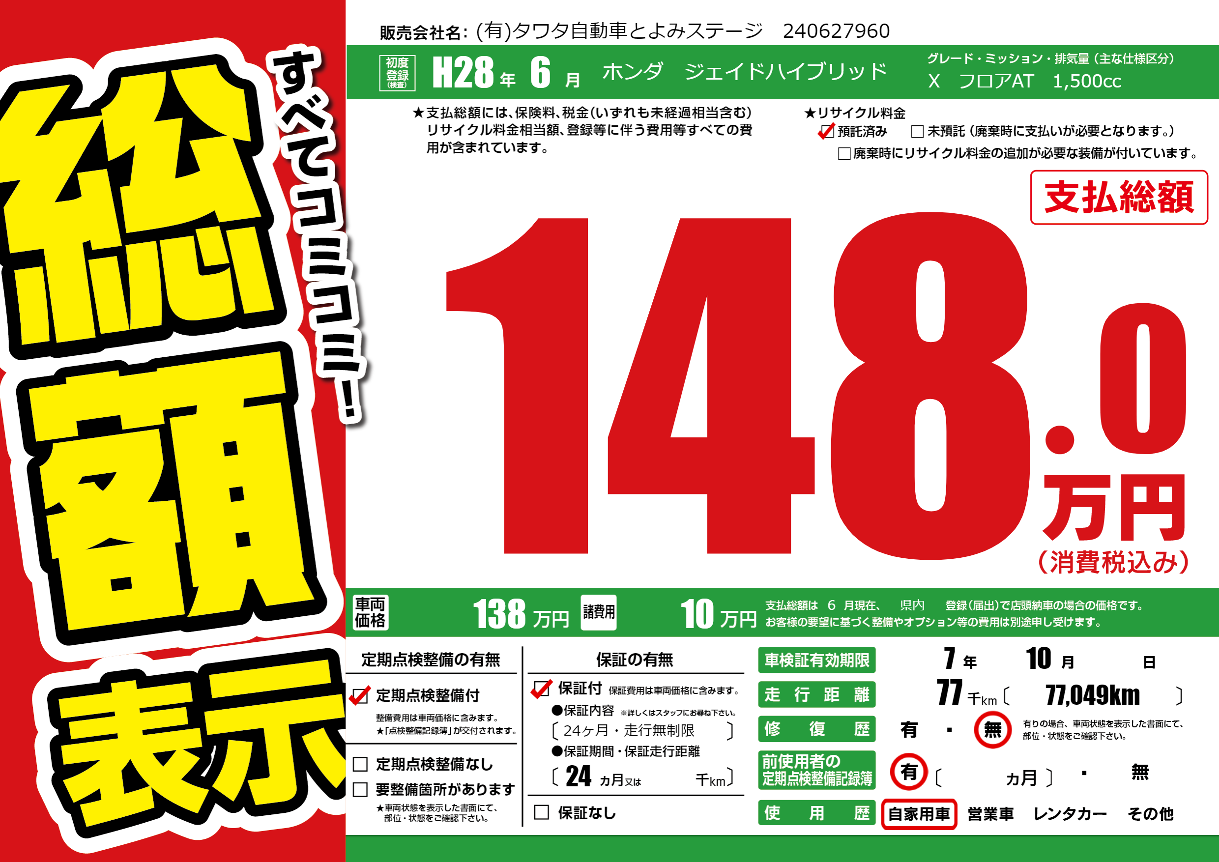 | 車名 | ホンダ ジェイドハイブリッド | グレード ミッション 排気量 |