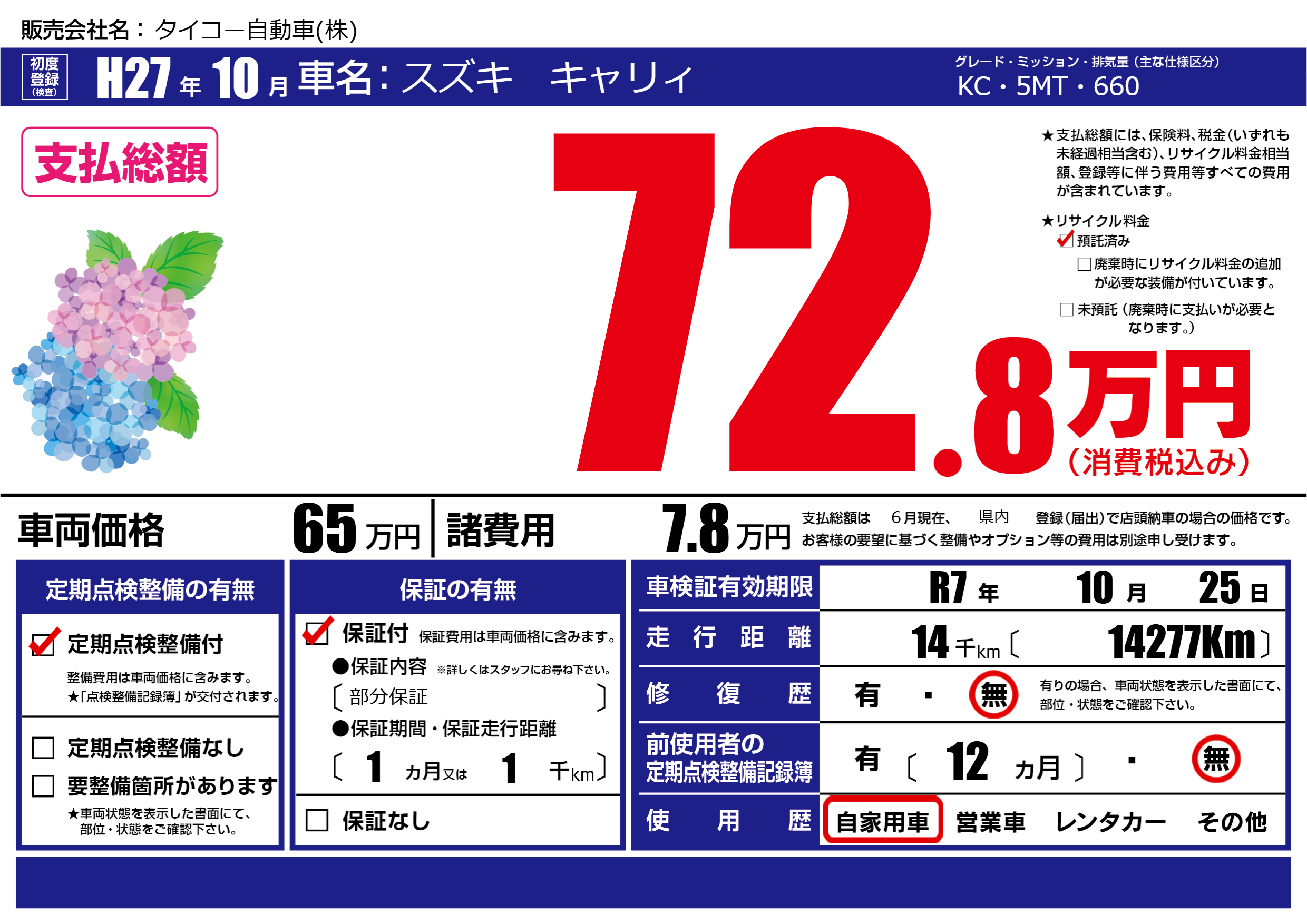 | 走行キロ | 1.4万km | 初年度登録 | H27年10月 |